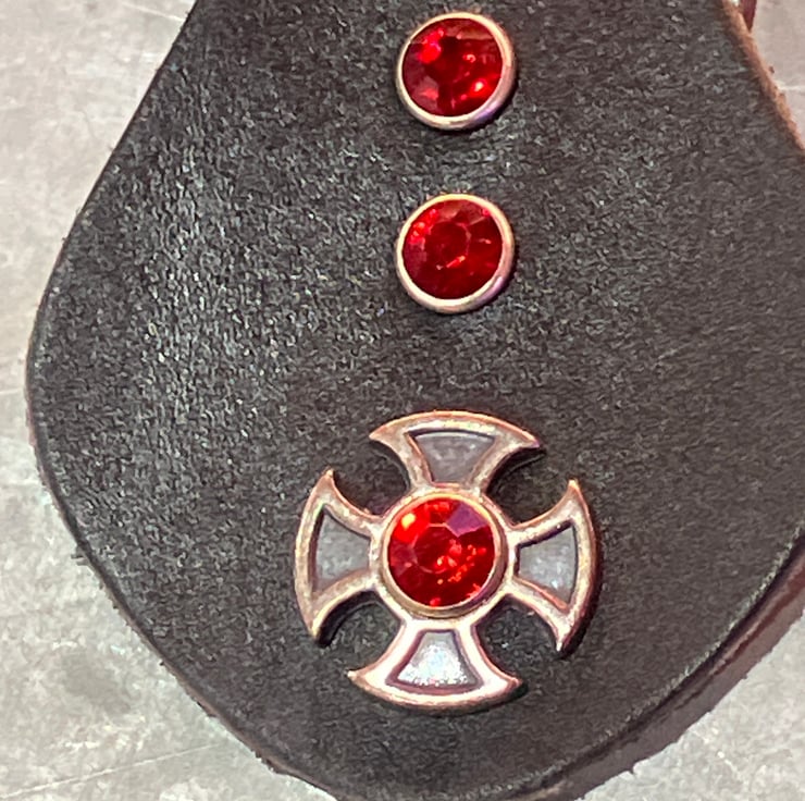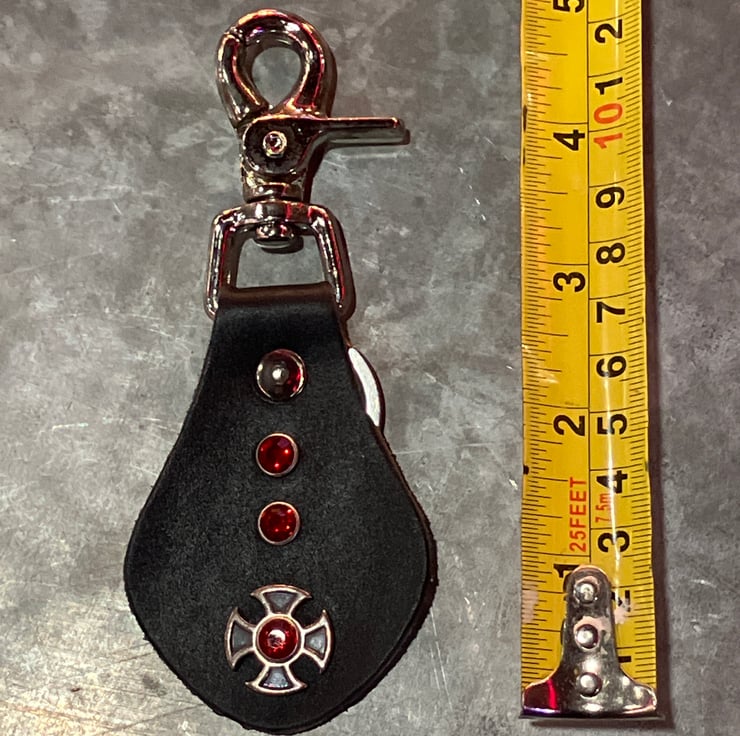 The Iron Design design is held in place with a red gemstone rivet - then also has 2 more red gemstone rivets attached to the key fob.