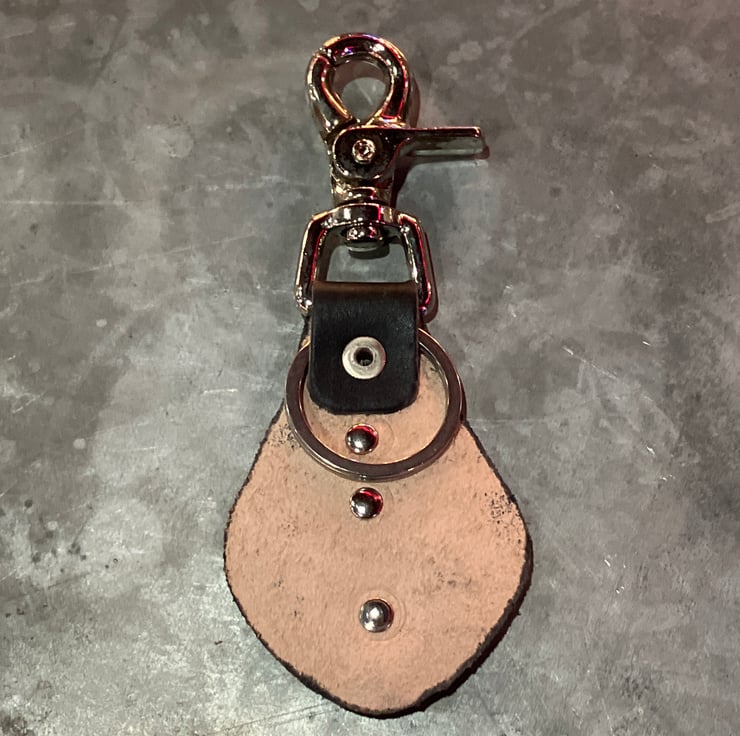 Trigger clip attachment on top to hang from your belt loops, with a split ring on the back side to put your keys on. The trigger clip and split ring are attached to the leather with a nickel rivet.