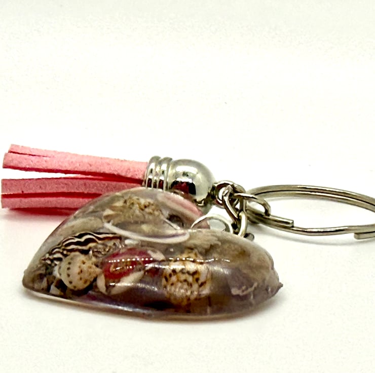 This cute little heart shaped keyring has real seashells set in resin with a pink tassel on a stainless steel keyring