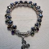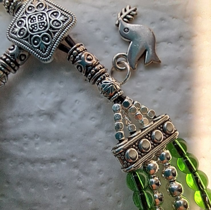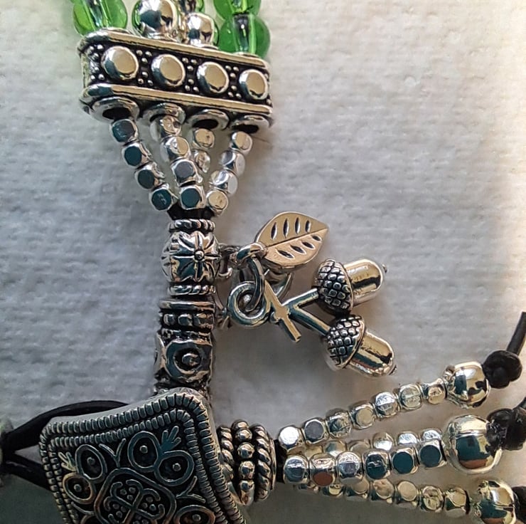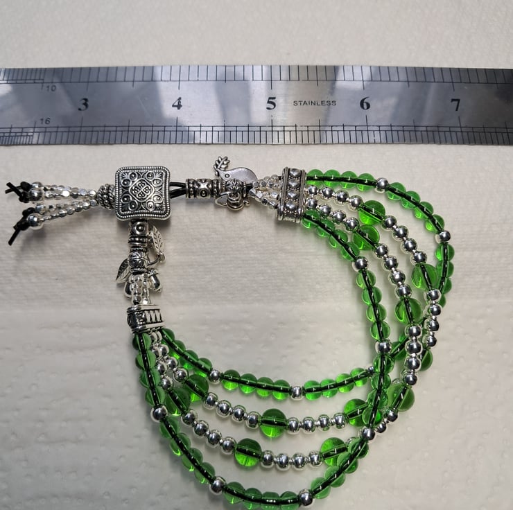 Beaded 4 strand Leather Bojo Bracelet. With green and silver beads and spacers. Two Tibeten silver charms, all strung on 1mm leather cord. With square button fastener. Will fit up 7.1/2" wrist. Handmade. Thankyou for looking .