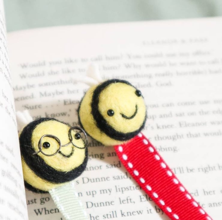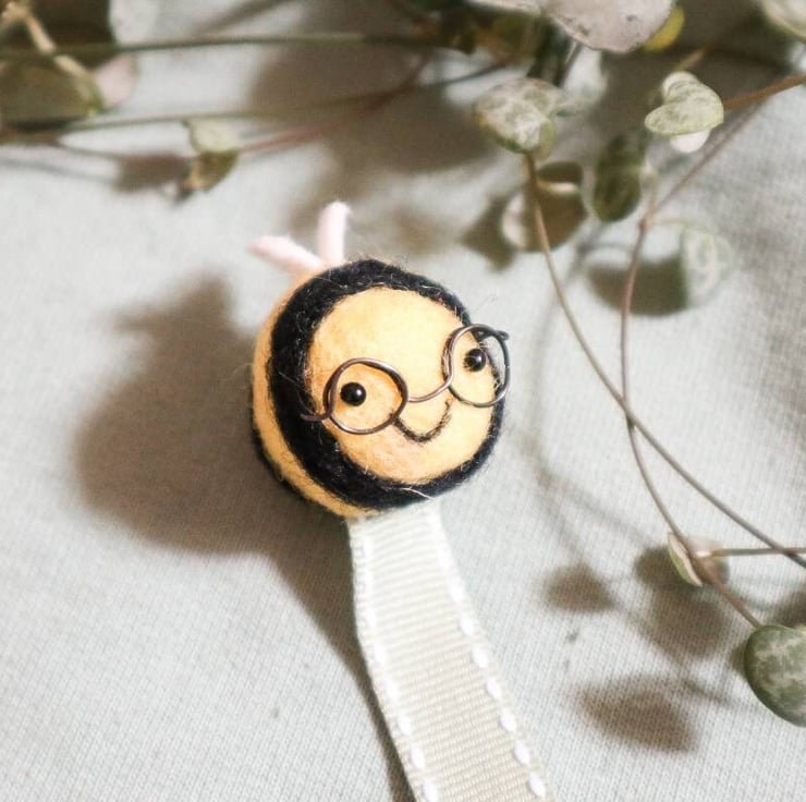 Woolly Bumble Bee Bookmark is handmade using the intricate craft of needle felting, and fastened on to a thick grosgrain ribbon.