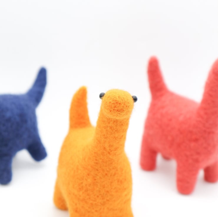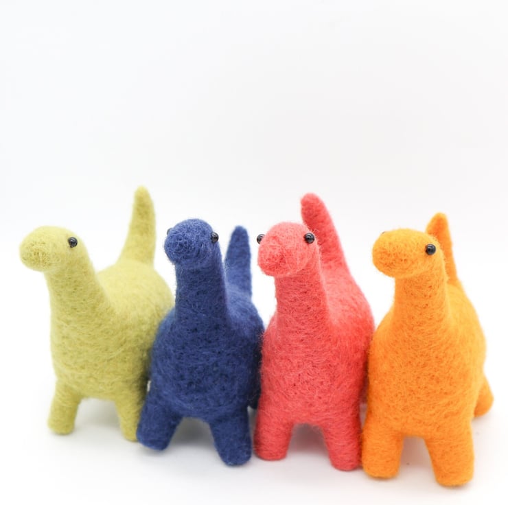 Each dinosaur is handmade and one of a kind. It measures 4 inches long and 4.5 inches tall. Please select which colour you would like for each dino when ordering. Colours may vary from those shown on the screen.