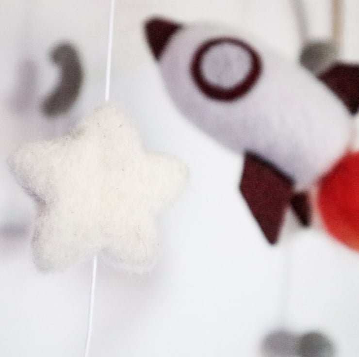 Our rocket mobile is made using the intricate art of needle felting. The woolly rocket is hand-felted from merino and Welsh wool, surrounded with an array of scandi style stars, bobbles and moons. It looks gorgeous hanging in a space themed nursery for a funky pop of colour!