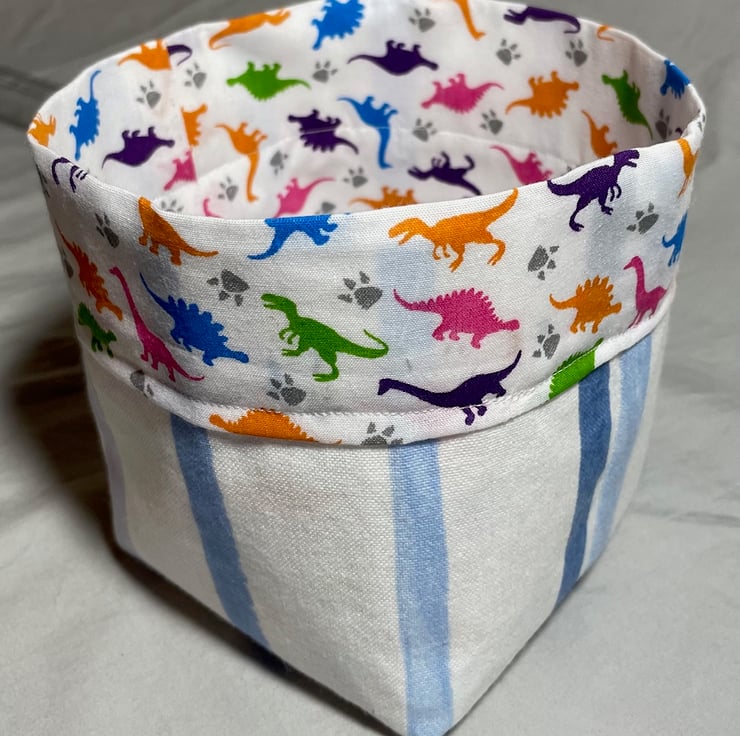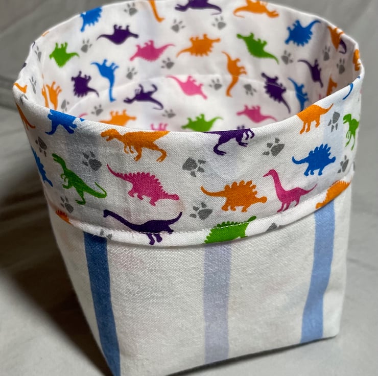 Handmade cotton fabric tub with contrasting lining, interfaced for extra strength and stability. You can fold the top over if you like that style, but because the lining extends over the outside, you don't have to - so you don't lose any storage capacity.