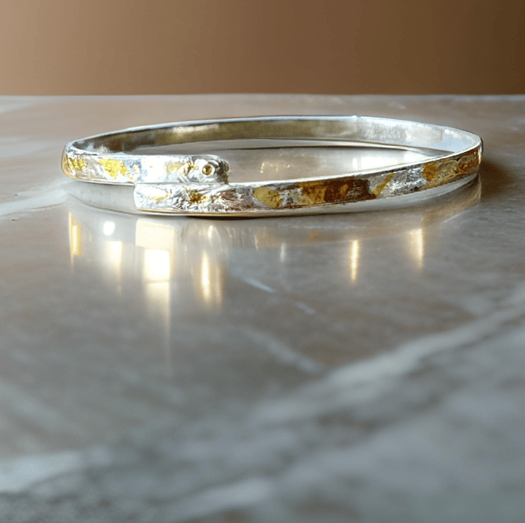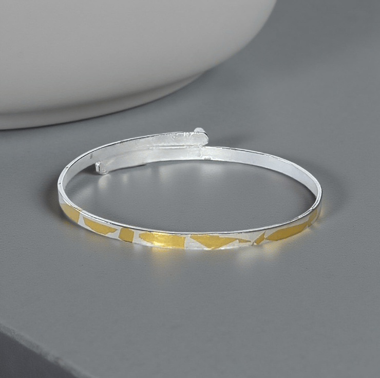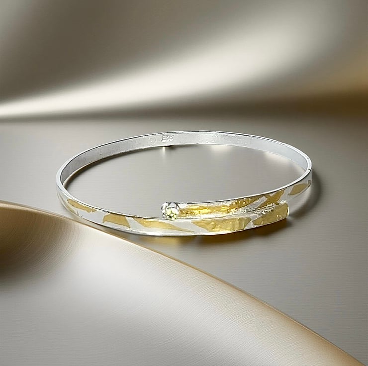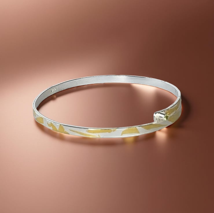Using the ancient Korean gilding technique of Keum-boo, this bangle features sterling silver with gold shapes for a luxurious silver gilt appearance. The process involves depleting the surface to reveal a layer of fine silver before using heat and pressure to bond 24ct gold foil. A delicate 2.5mm cubic zirconia gemstone in a citrus shade. Handmade to order In Woolacombe North Devon.
