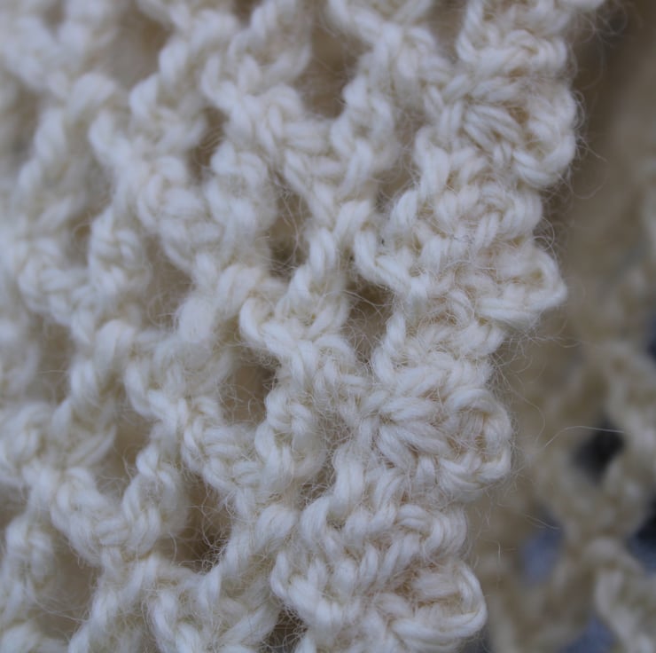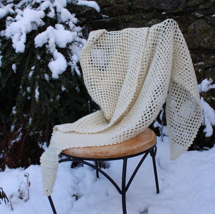 A crochet 100% wool shawl, handmade, in a triangle shape 196 cm by 144 cm by 144 cm. Sheep's wool in natural colour.