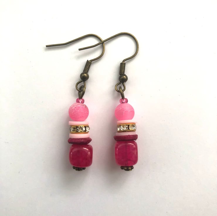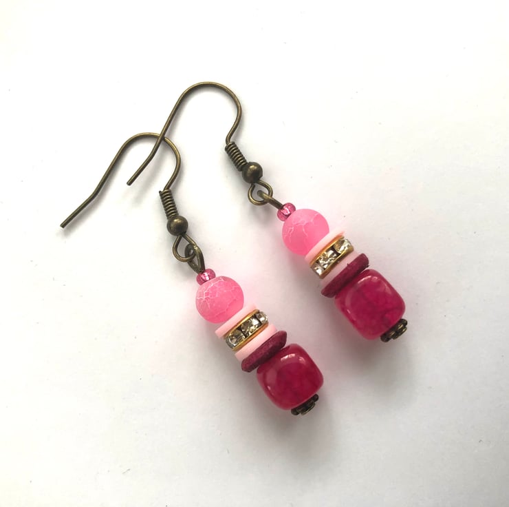 Cerise pink dangle drop earrings handmade by me using up-cycled and shop brought beads.