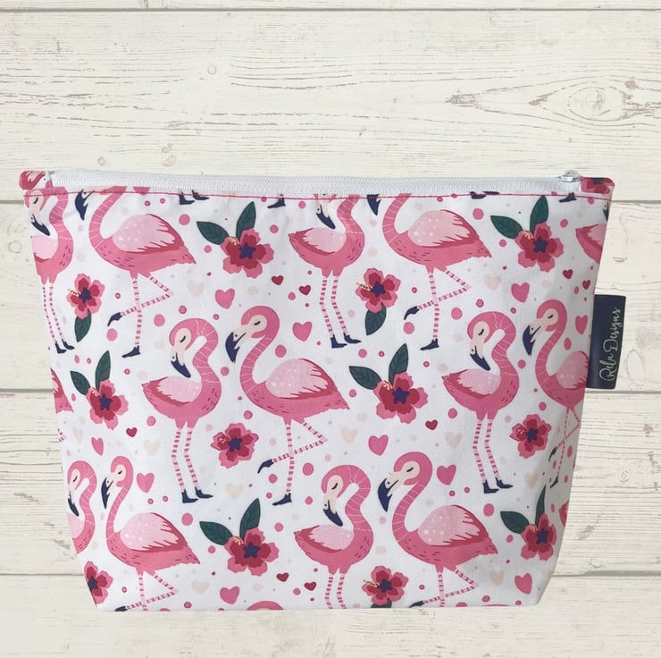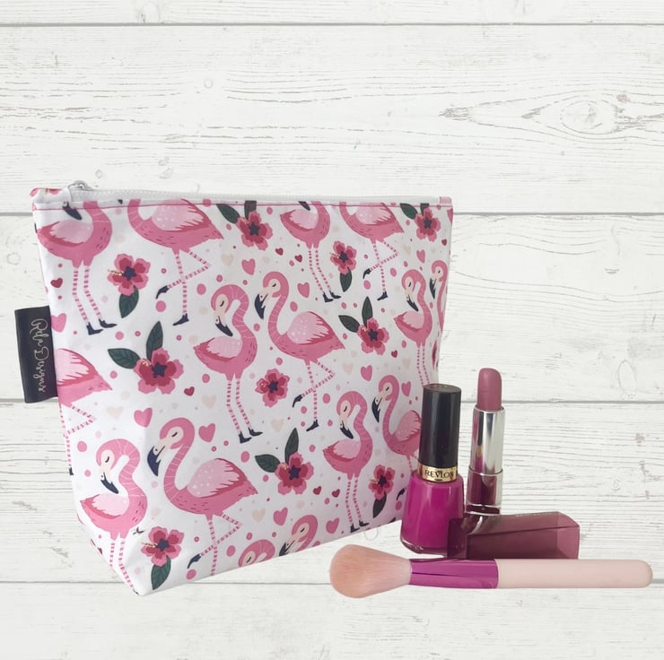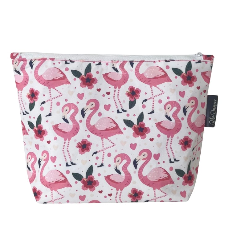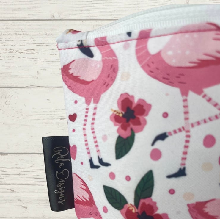 A handmade cotton pouch featuring a playful pink flamingo print with flowers and hearts. Perfect for adding a pop of colour to your everyday essentials, this zip pouch is both practical and pretty.