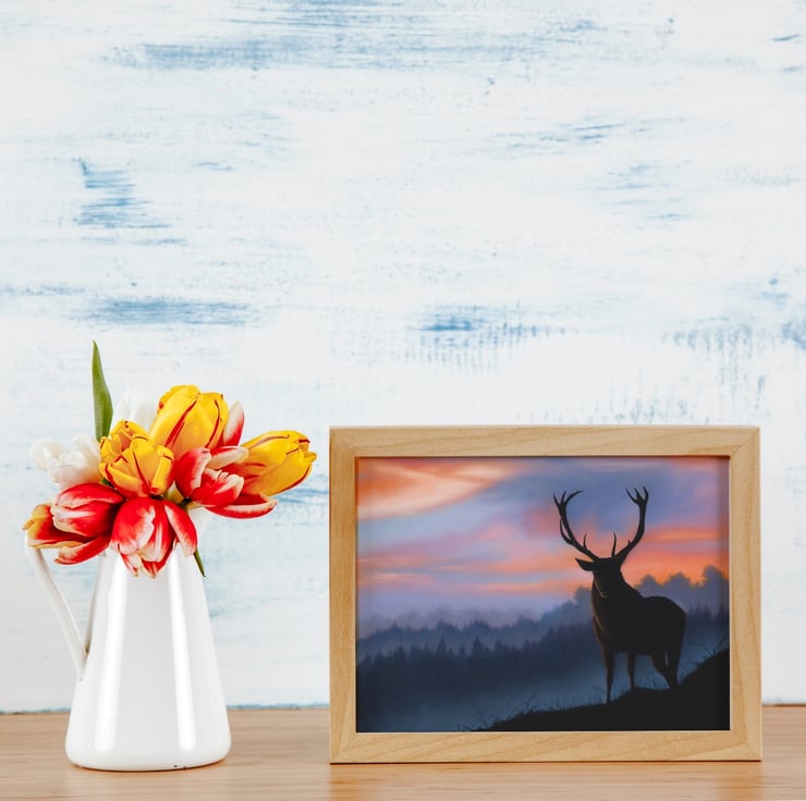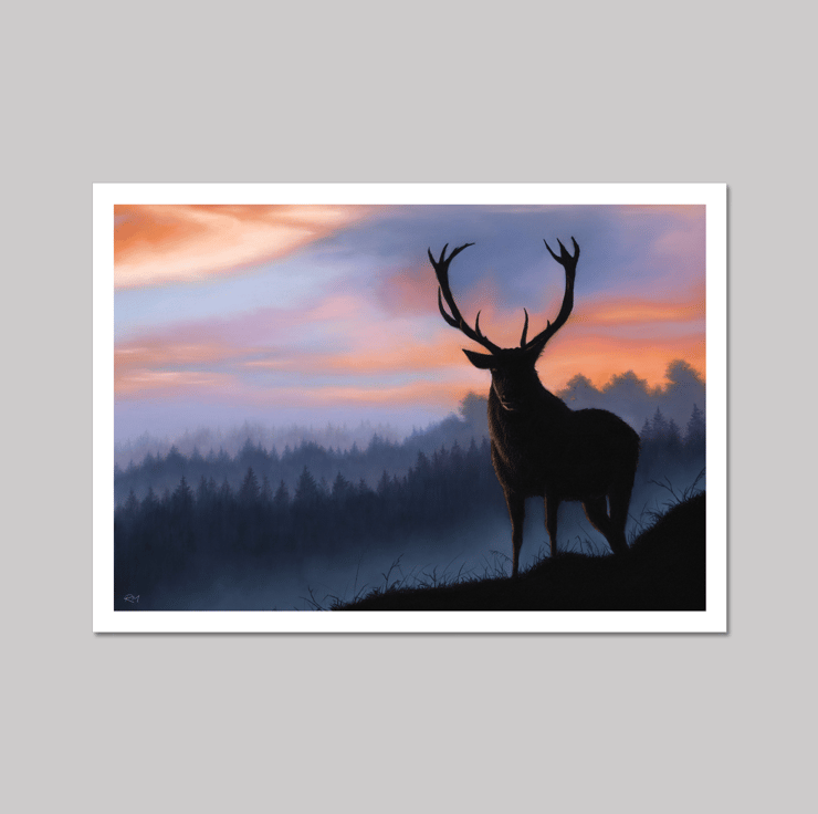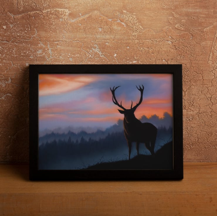 "Guardian of the Forest". A bold and striking depiction of a deer in a twilight wilderness. The silhouette form of the deer is contrasted with the evocative background colours to make a beautiful and original work of art that would create a wonderful statement on any wall.