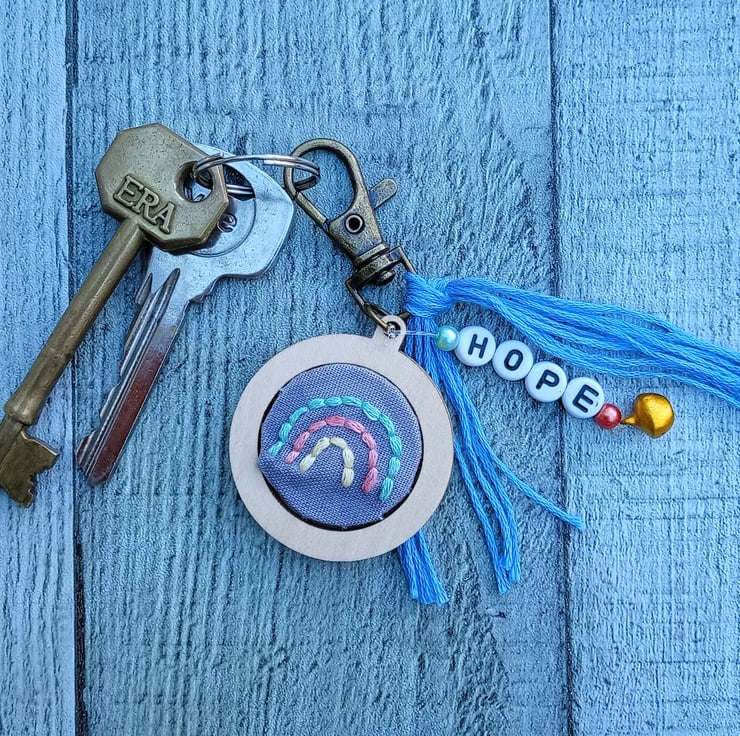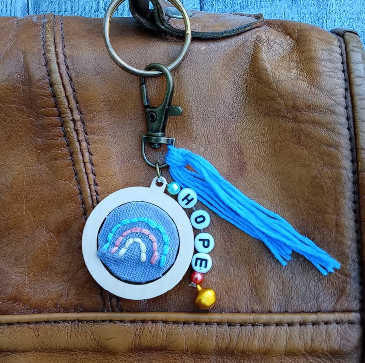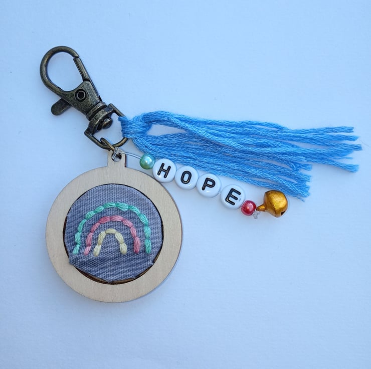 A hand embroidered rainbow design keyring/bag charm with the word ‘hope’ in letter beads, adorned with coloured beads and a little bell, finished with a blue tassel.