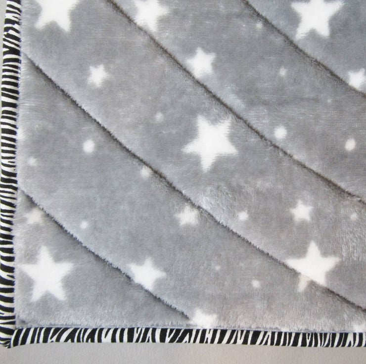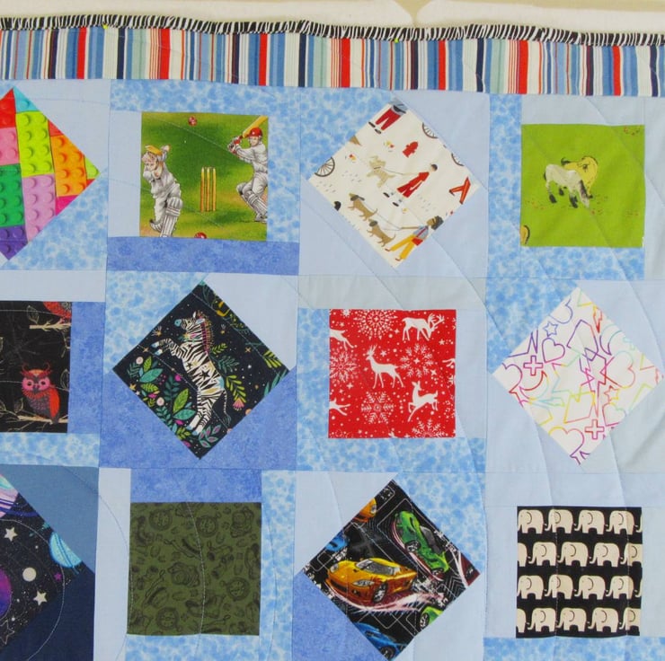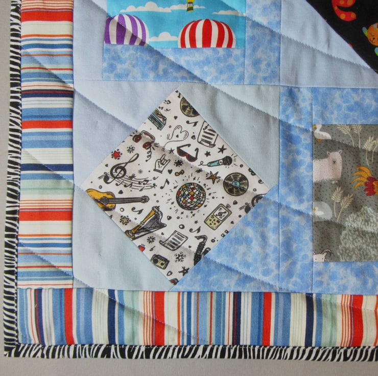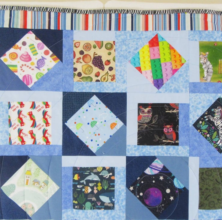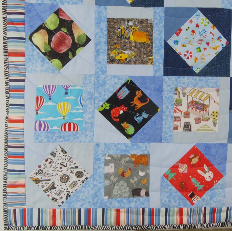 All the fabrics used for the patchwork top of the quilt are 100% cotton. The silky soft fleece backing is 100% polyester. Between the two outer layers is a quilt wadding made from re-cyled fibres (70% cotton, 30% polyester).