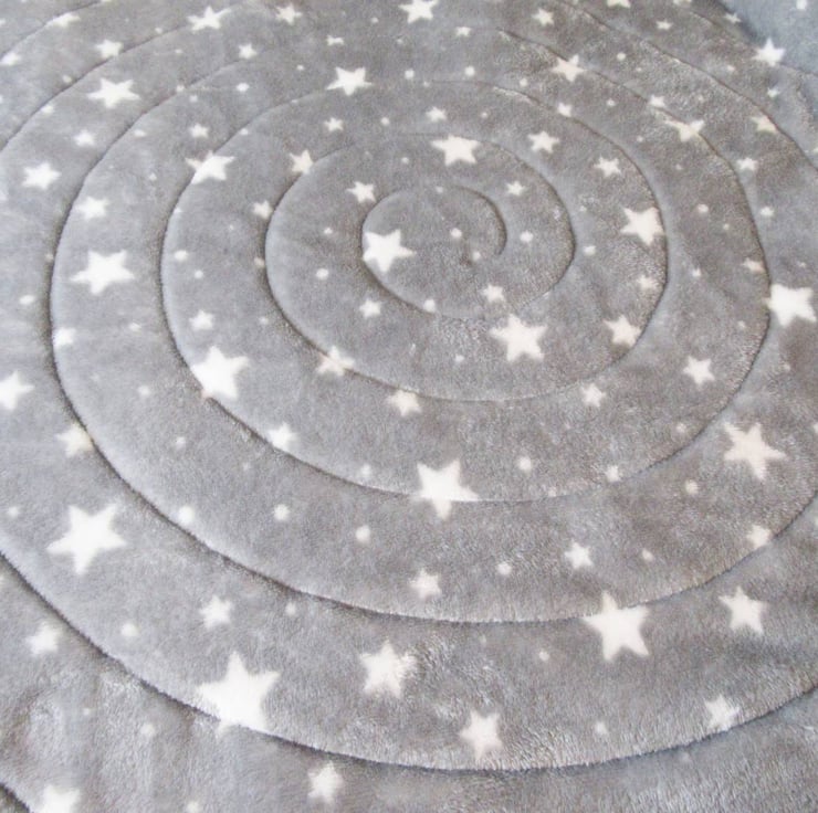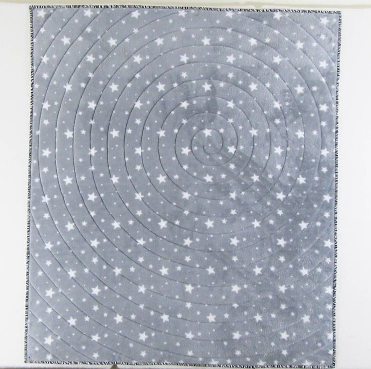 I've stitched a spiral quilting pattern to hold the three layers together and add texture to the front and back of the quilt. The edges of the quilt are secured in a double layer binding made from a black & white 100% cotton print.