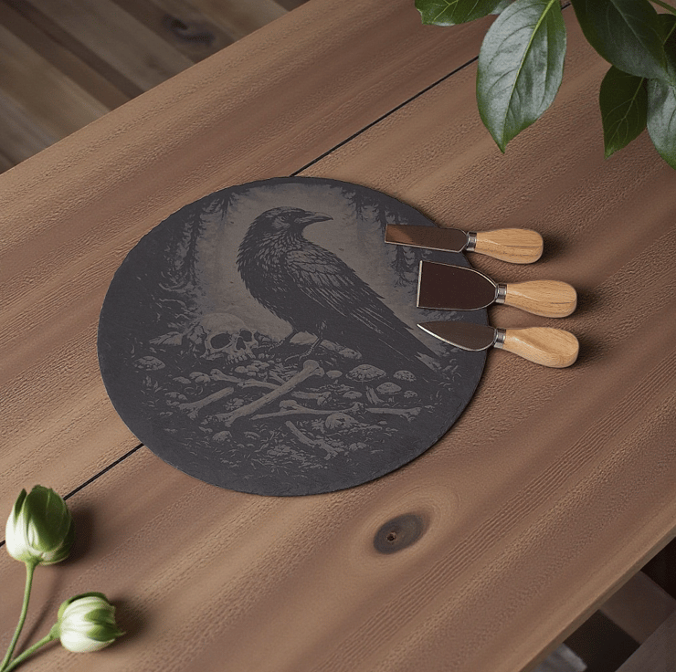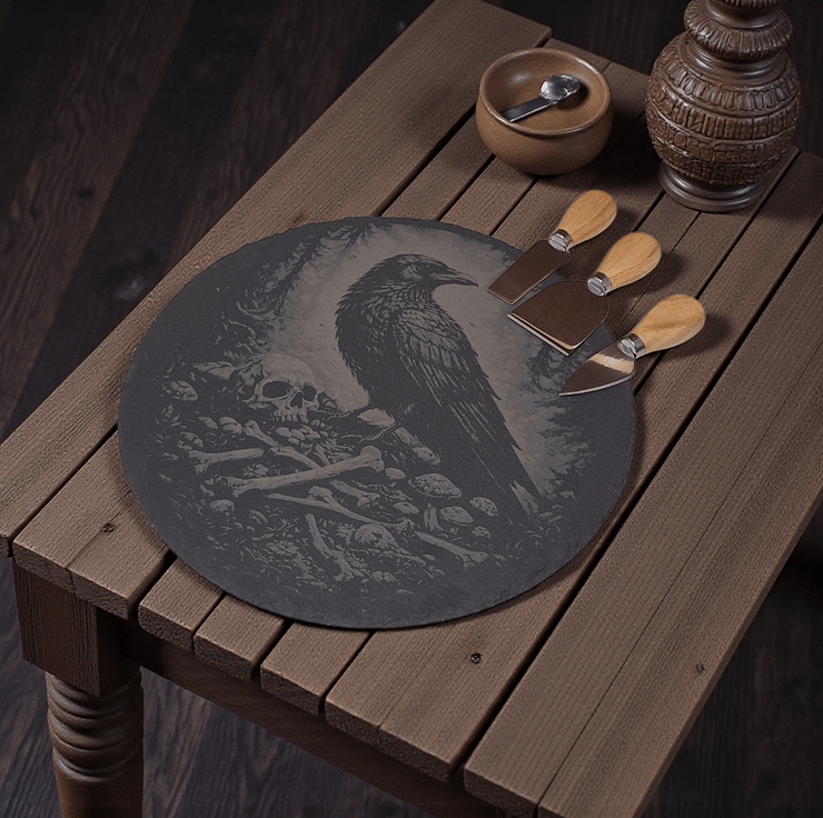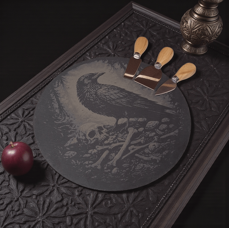 Gothic Raven Slate Cheeseboard – Dark Art Serving Board with Raven & Skull Desig