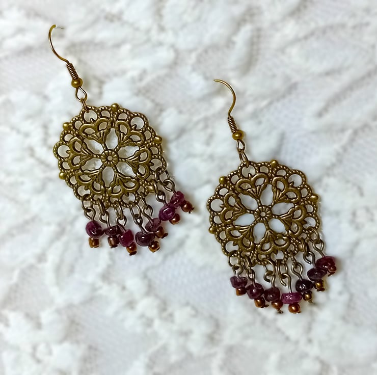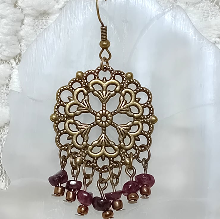 These gorgeous earrings are made in the Bohemian style with genuine Garnet chip gemstones and a Filigree Bronze charm. These were made with Garnet lovers and January babies in mind!. They have a fish hook setting but you have the option for a lever back at no extra charge.