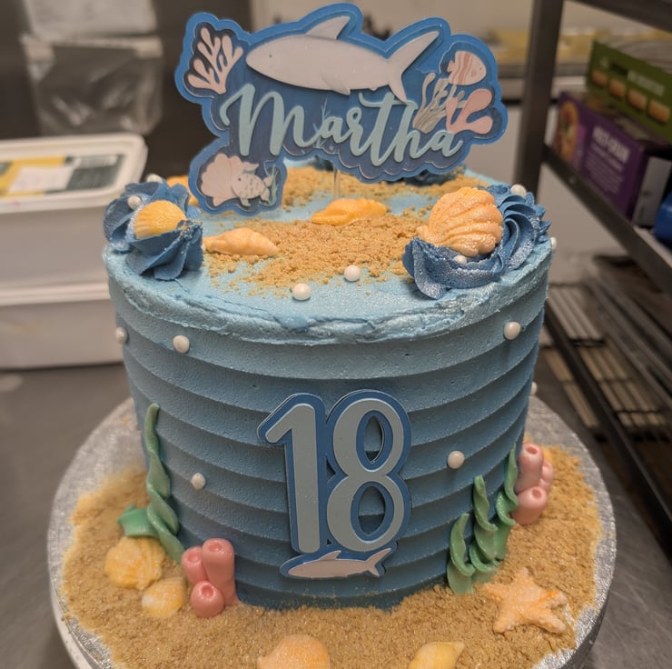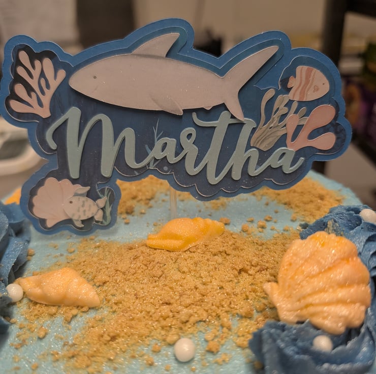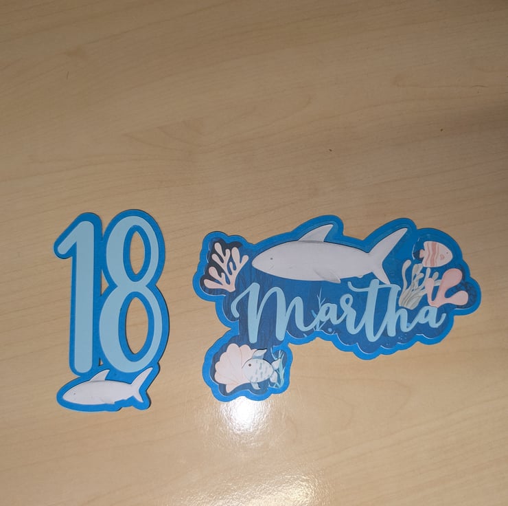 This set of Cake toppers comes in two parts. There is the recipients name with some die cut sea creatures and their age. The toppers can be merged to be 1 piece or the name and age can be swapped.