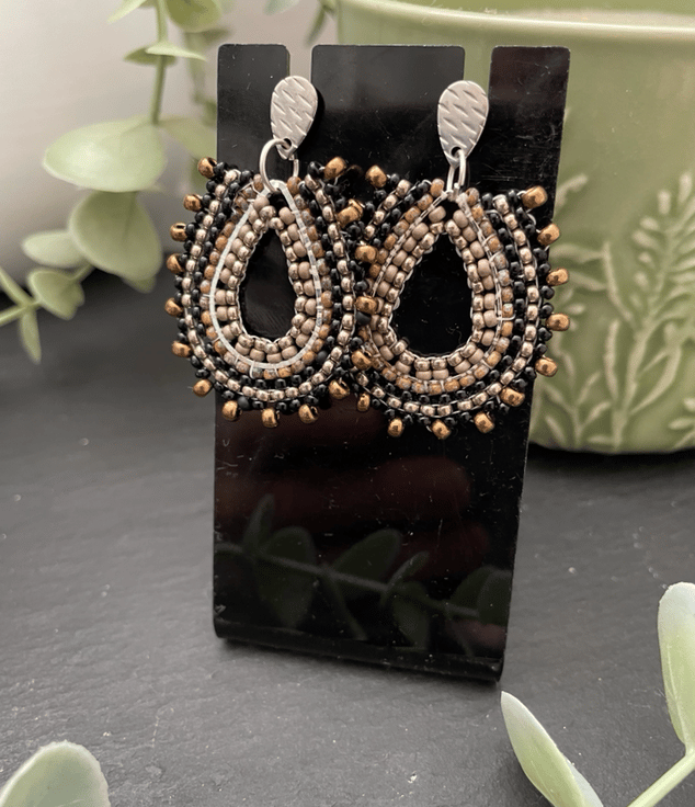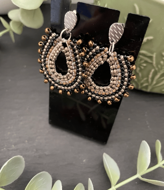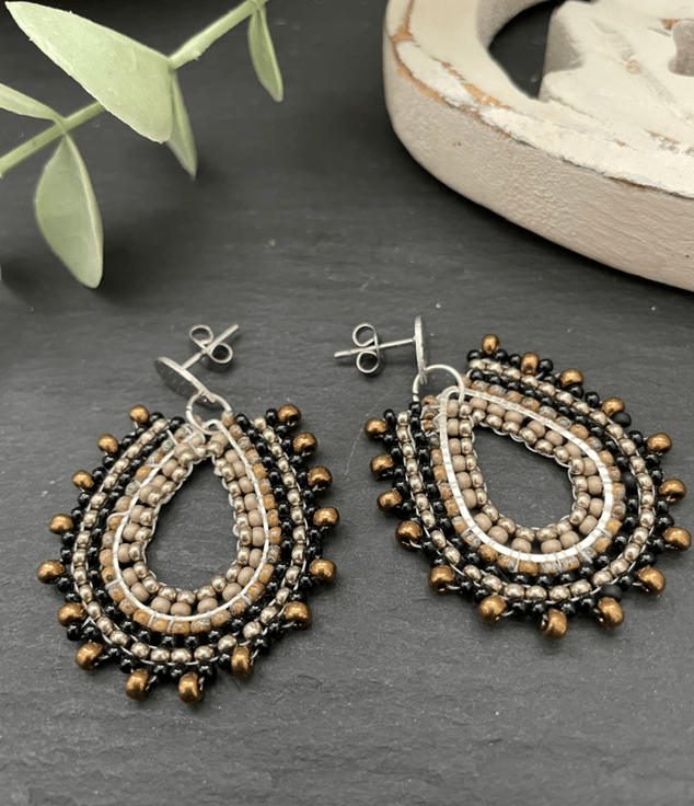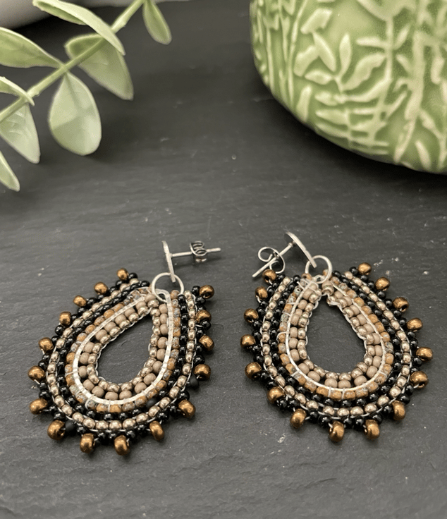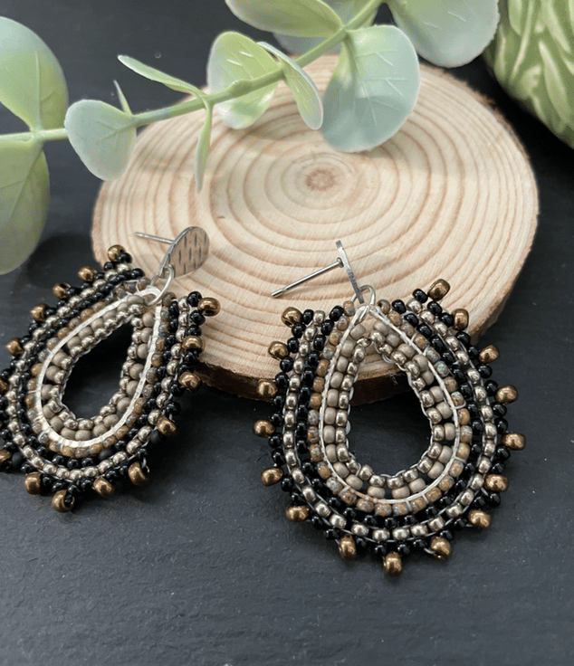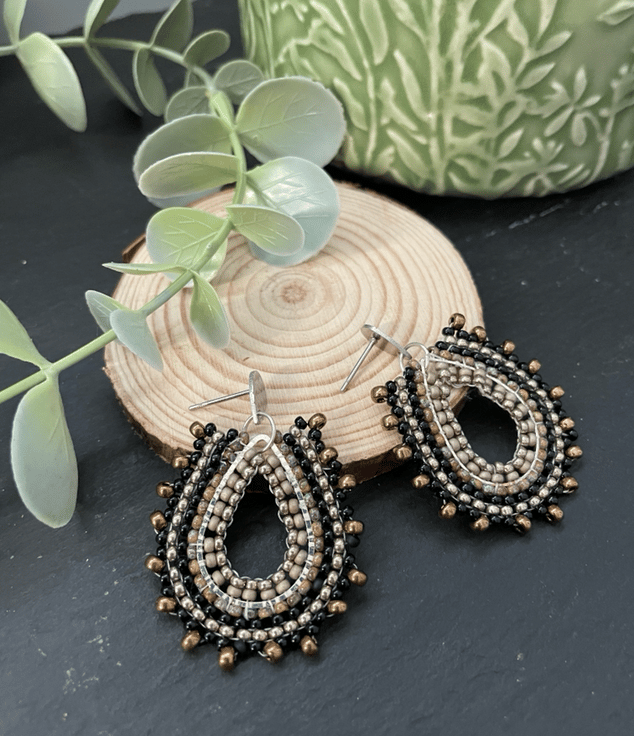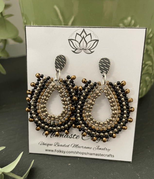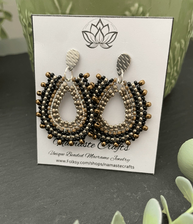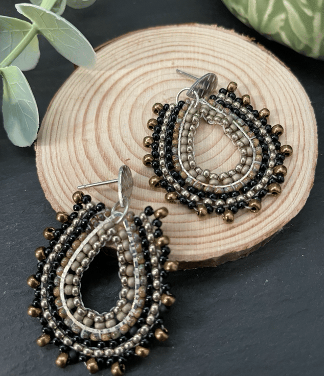 Parallel rows of Czech glass seed beads have been hand woven to outline the silver teardrop shape creating a beautiful pair of earrings that encompasses handcrafted, one-of-a-kind beauty ready to gift to that special person or to keep.