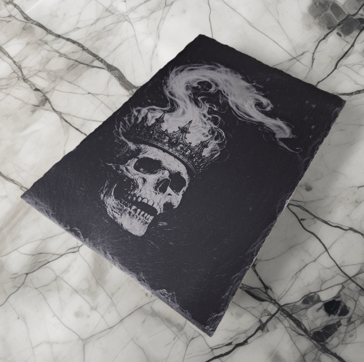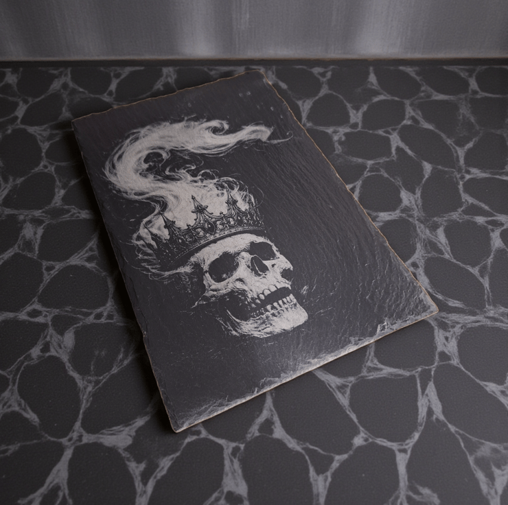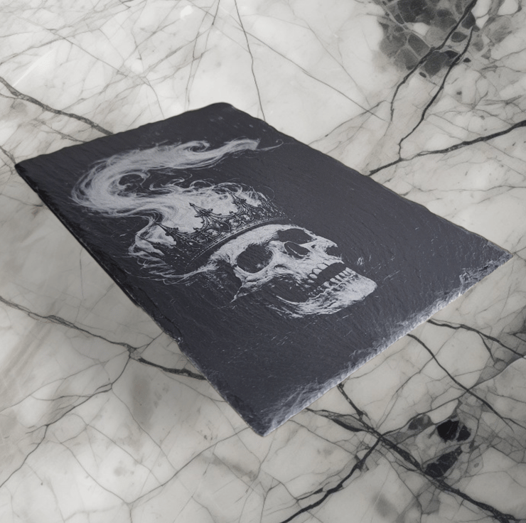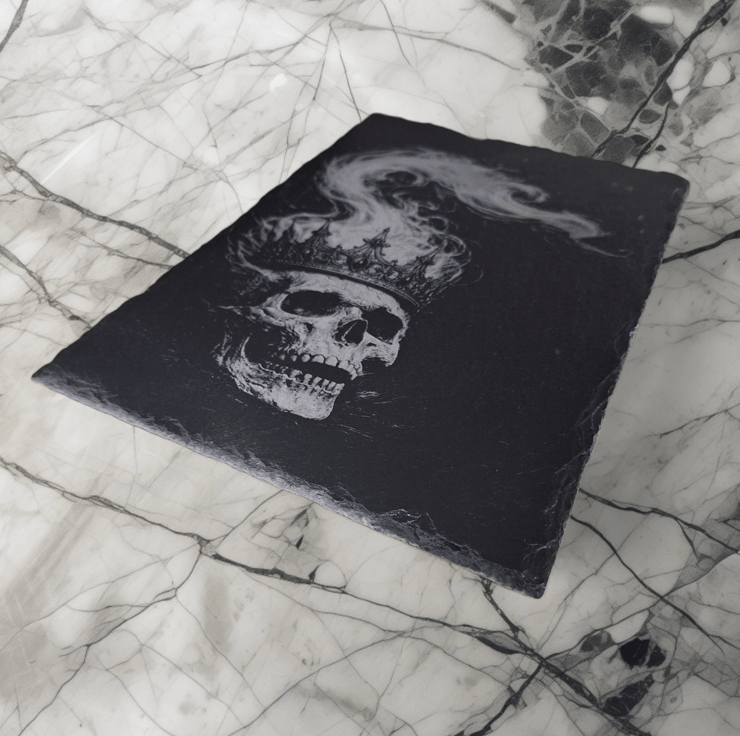 Engraved into natural slate, the design features a crowned skull with soft, swirling smoke rising above it. The imagery draws on themes of transformation, impermanence, and quiet power, giving the piece a strong, atmospheric presence.
