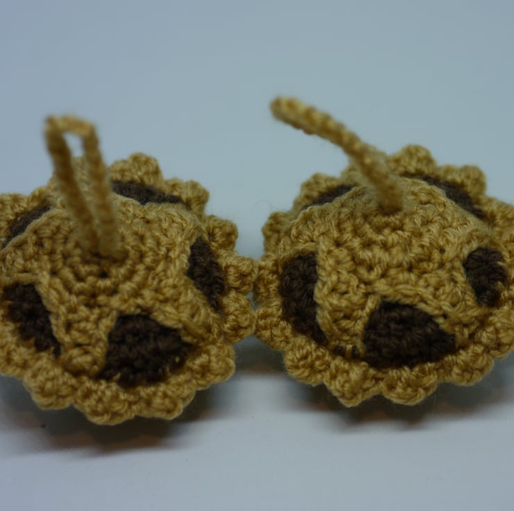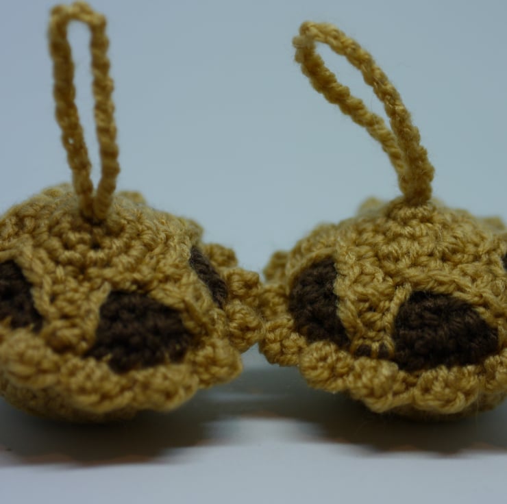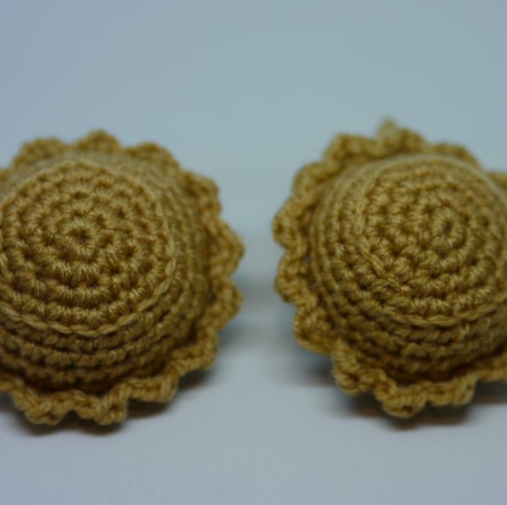 Crochet mince pie decoration pair. This festive pair of Christmas decorations would be a great addition for any seasonal display. Created in a warm pastry coloured yarn frilled edge with a star design on top and useful hanging loop. filled with hollowfiber stuffing to give a pleasing shape. Each pie measures approximately 7cm across and 4cm deep excluding loop.