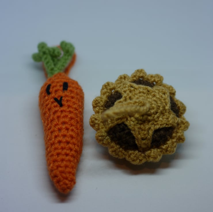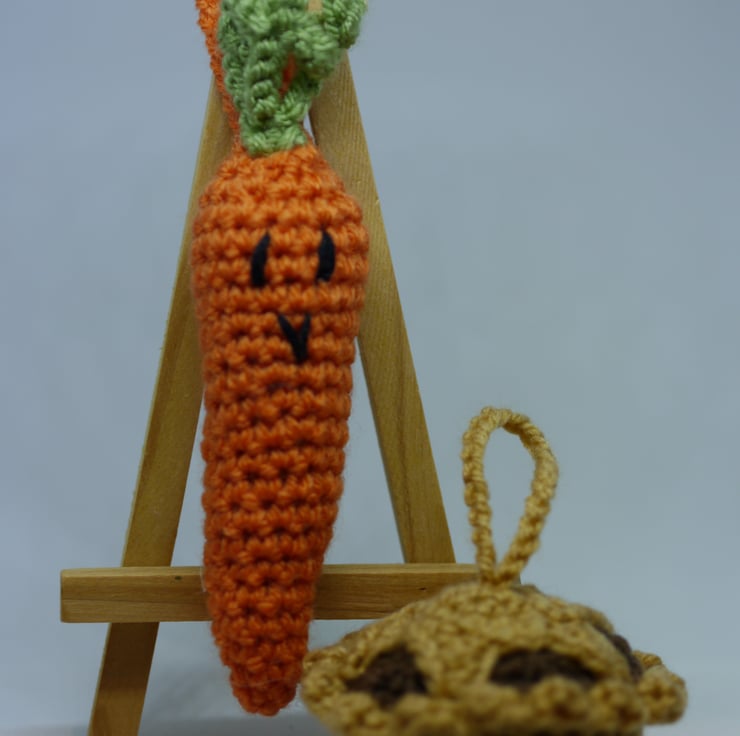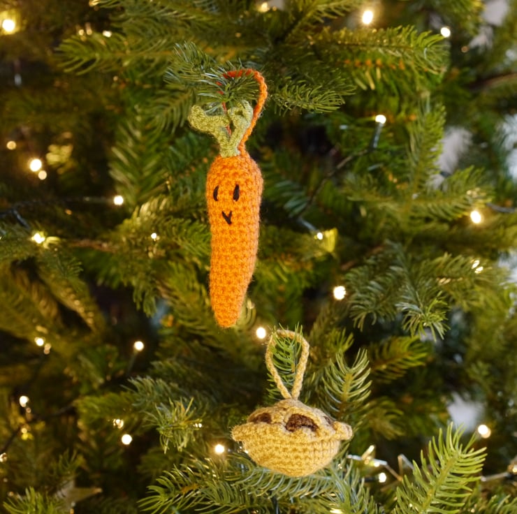 Lovingly crochet in soft yarn, the mince pie has a frilled edge and star decoration and the carrot is a fun green top and face design, both have hanging loops ready to adorn the tree.