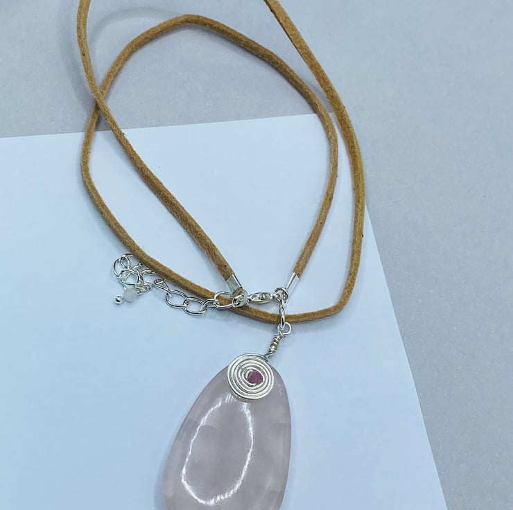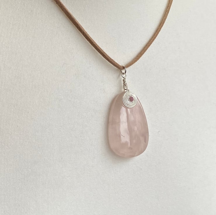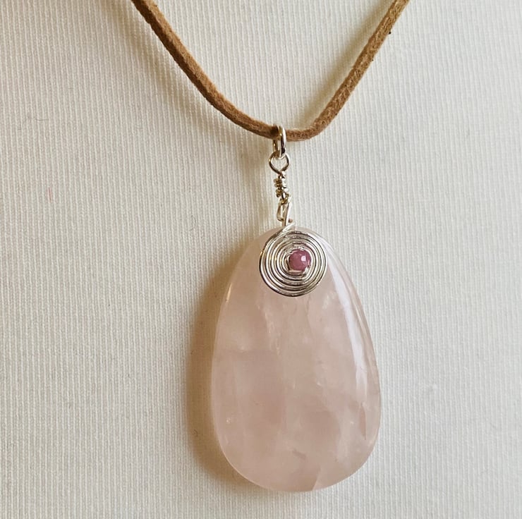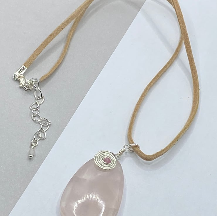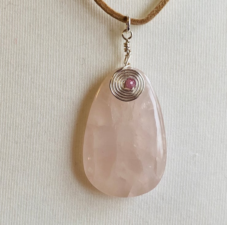 This pendant features a beautiful soft pink oval shaped piece of rose quartz, topped with a silver plated wirework spiral with a tiny faceted pink tourmaline at its centre.