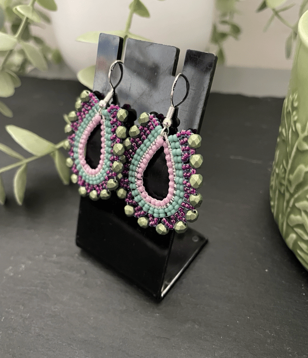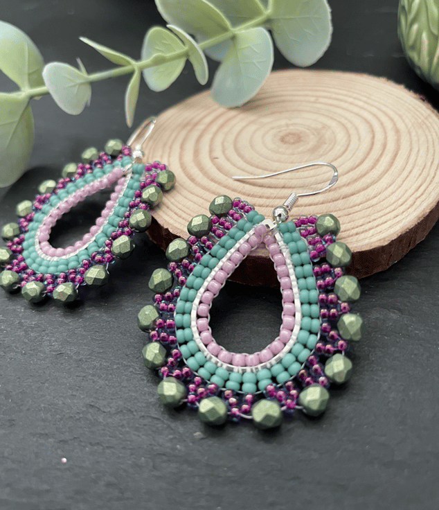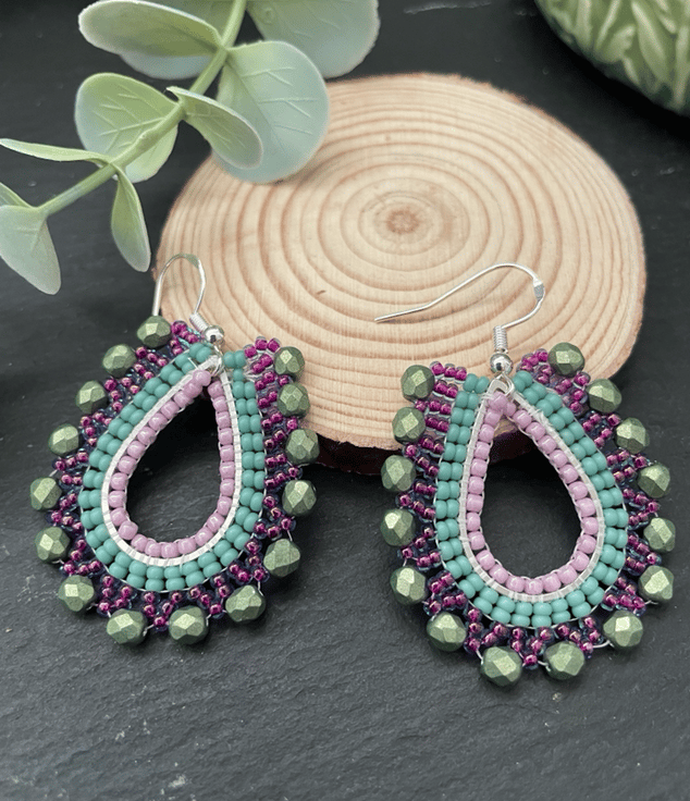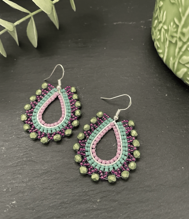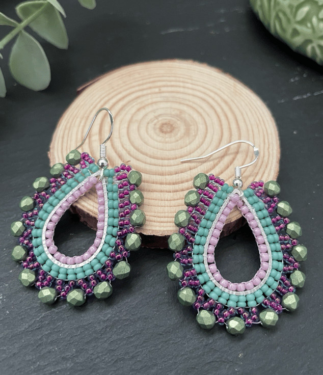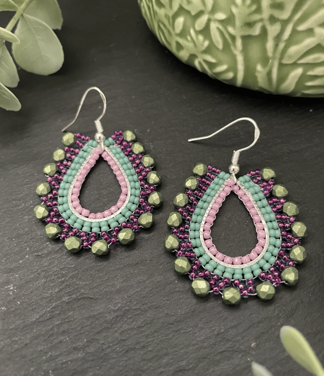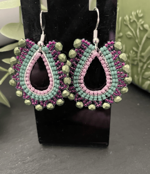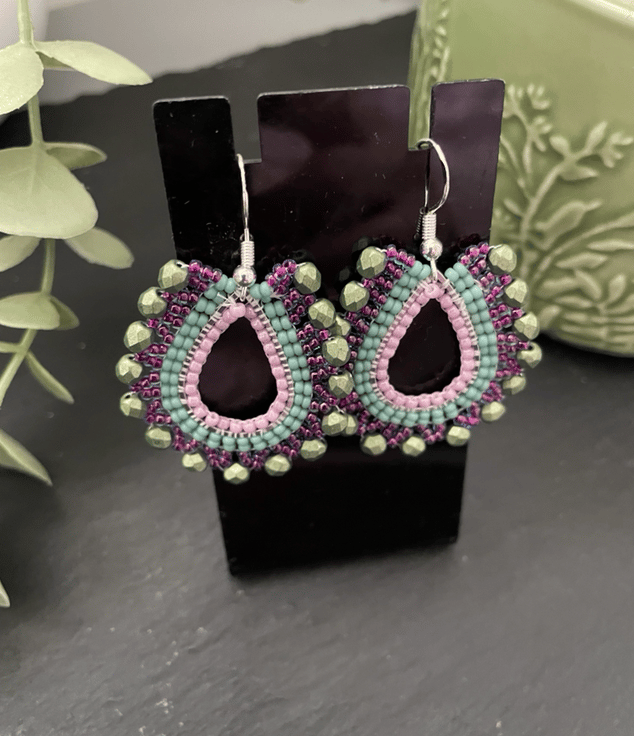 Parallel rows of Czech glass seed beads have been hand woven to outline the silver teardrop shape creating a beautiful pair of earrings that encompasses handcrafted, one-of-a-kind beauty ready to gift to that special person or to keep.