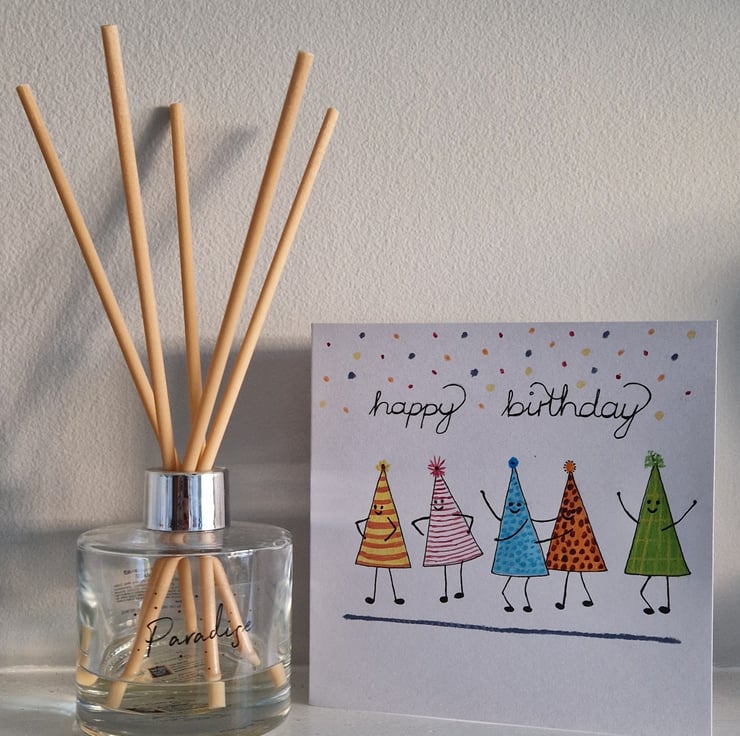 Happy Birthday colourful watercolour of dancing party hats, suitable for any age.