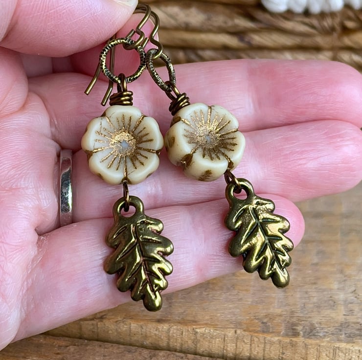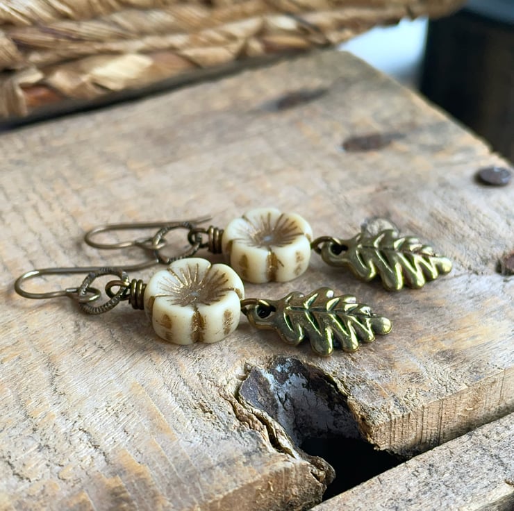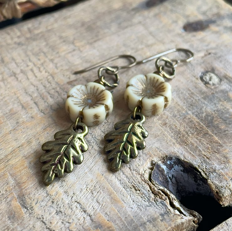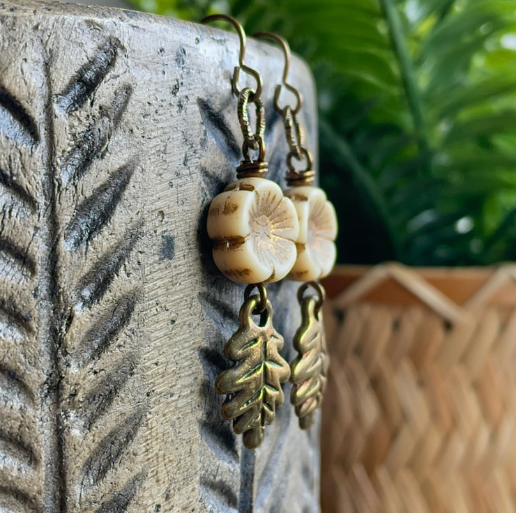 These elegant handmade earrings feature Czech glass flower beads in a soft cream shade, finished with a subtle golden bronze wash around the edges and within their carved centres.