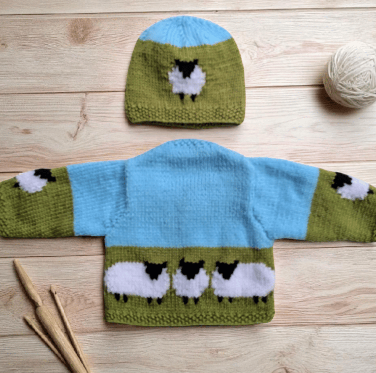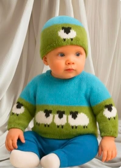 This cute knitting pattern is designed for children from birth up to 18 months. It features adorable sheep motifs: three on the front of the sweater, three on the back, and one on each sleeve. The delightful combination of colours makes the project both fun and interesting.