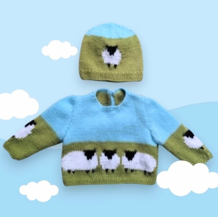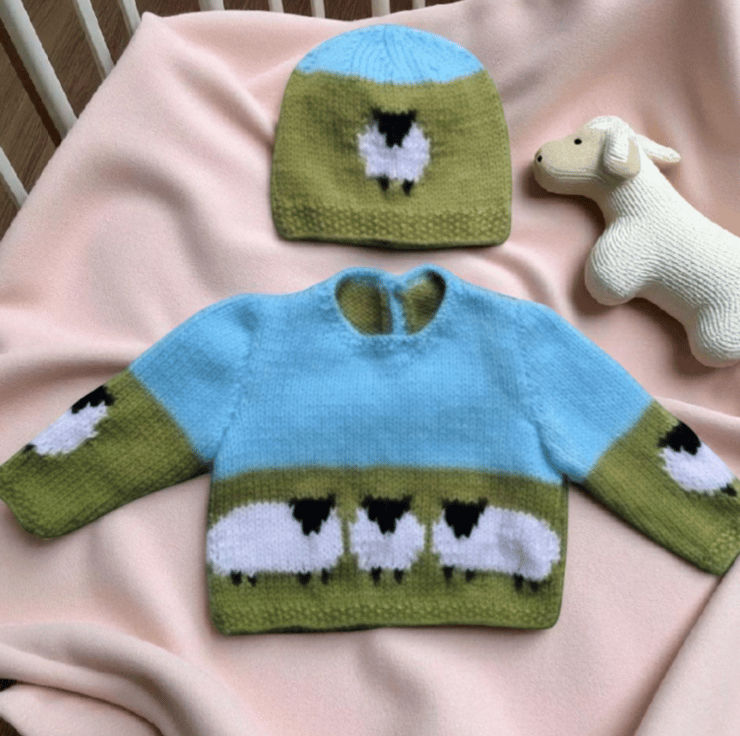 The pattern uses unisex colours, making it suitable for knitting before the baby's arrival or whenever a change from traditional pink and blue is desired. It includes clear colour coding for each size, as well as large, colourful charts for the sheep motifs.