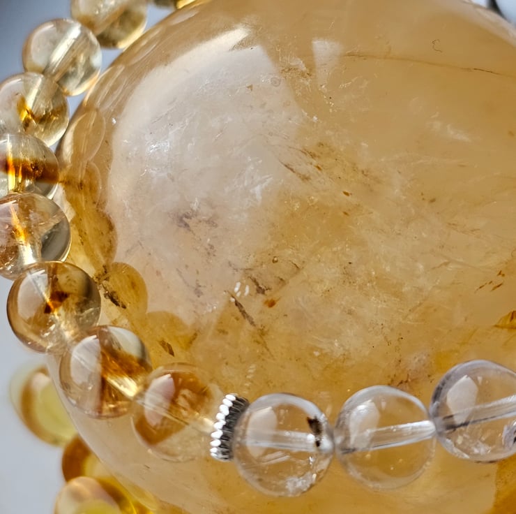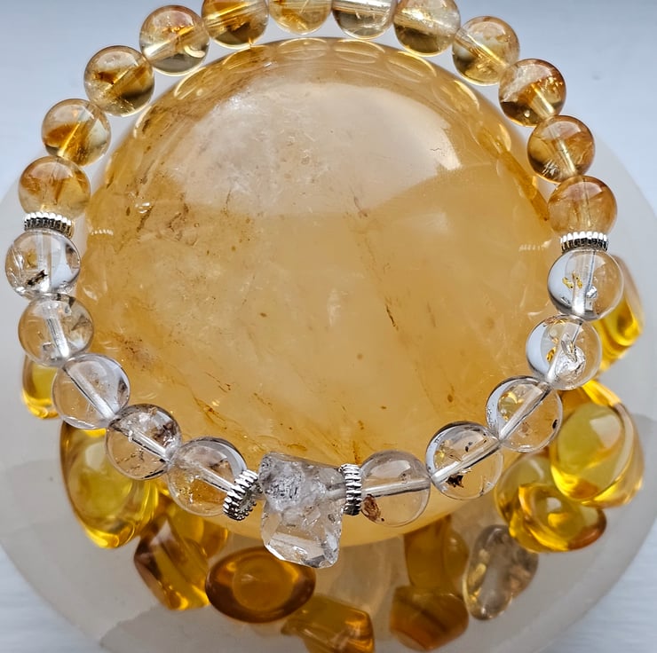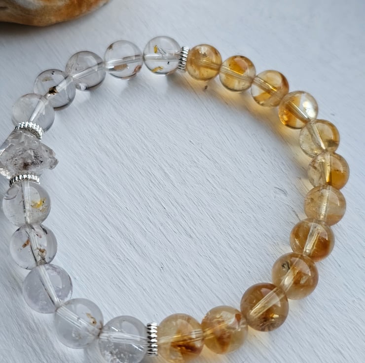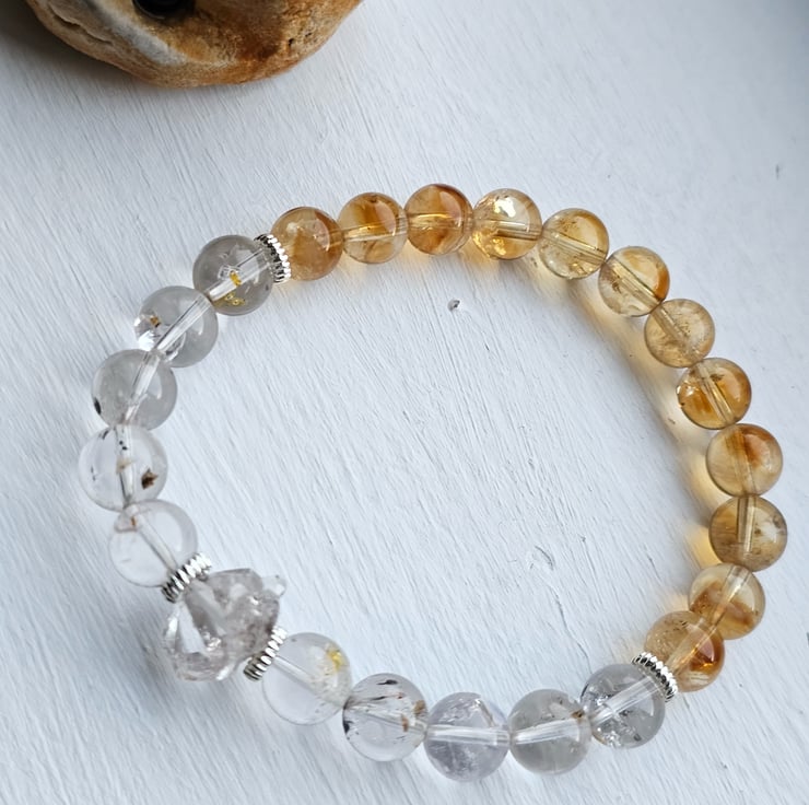 This handcrafted bracelet contains Citrine Clear Quartz and Herkimer diamond
