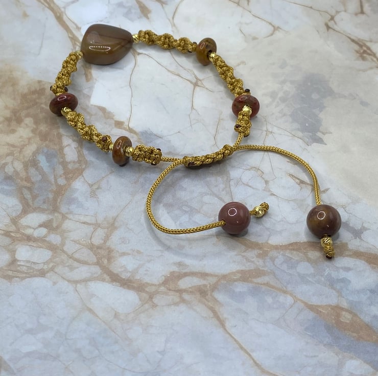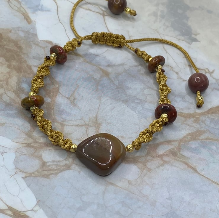 A spiral knotted macrame cord slider bracelet with a central burgundy coloured mookaite stone. The gold tone cord has donut shaped mookaite stones woven in with gold plated round spacer beads, and each cord end is finished with matching 6mm mookaite rounds and more gold spacers.
