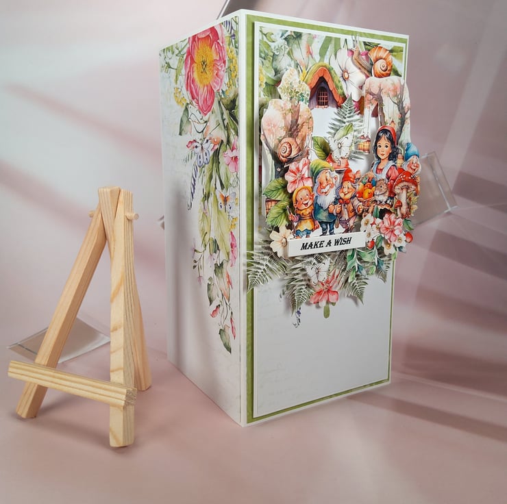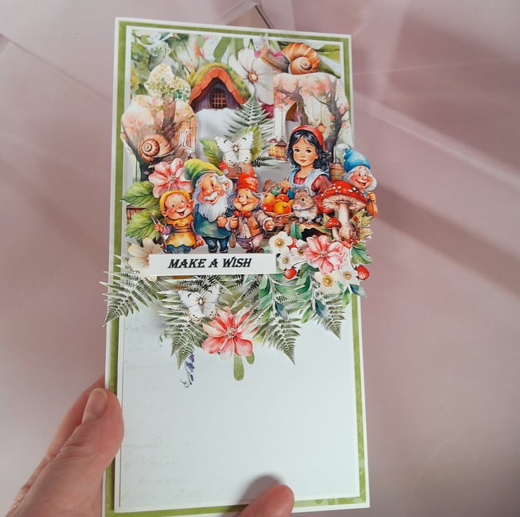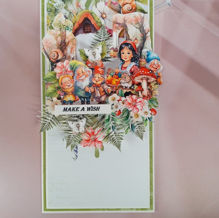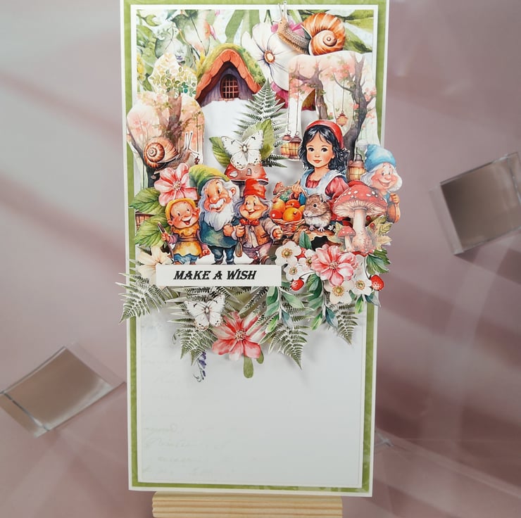 A charming handmade greeting card inspired by the fairy tale of Snow White and the Seven Dwarfs.