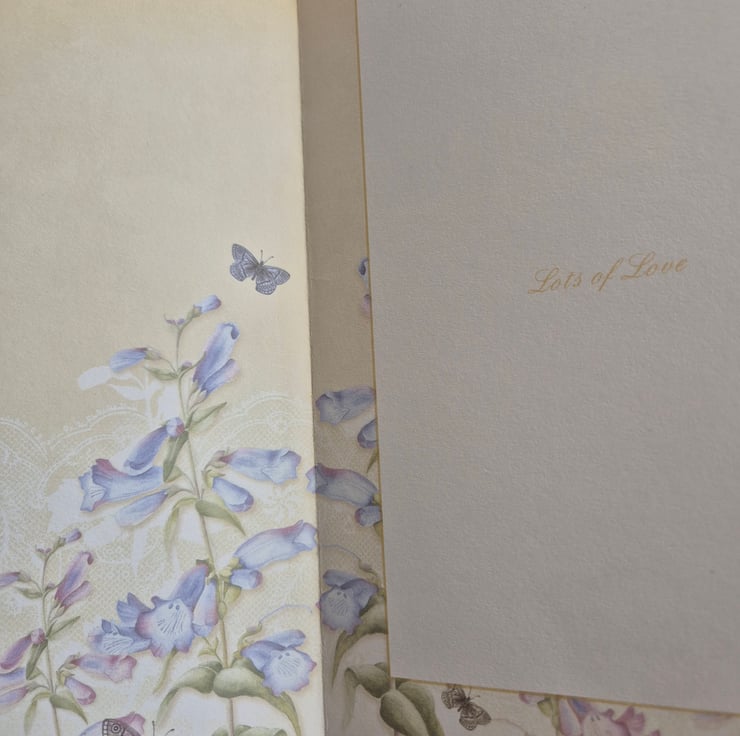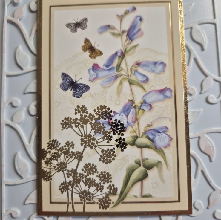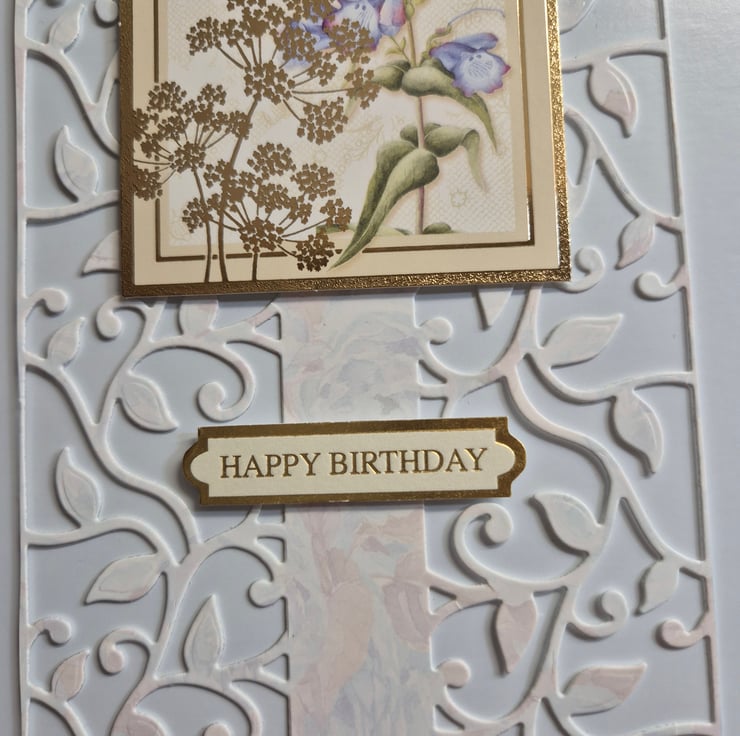 Handmade ladies birthday greetings card with beautiful die cut trellis and a topper with flowers and butterflies. The card is made from high quality Hunkydory cardstock and is approximately 6" x 8".