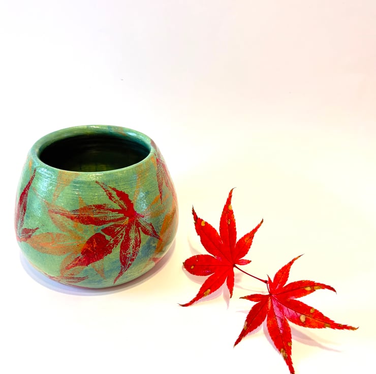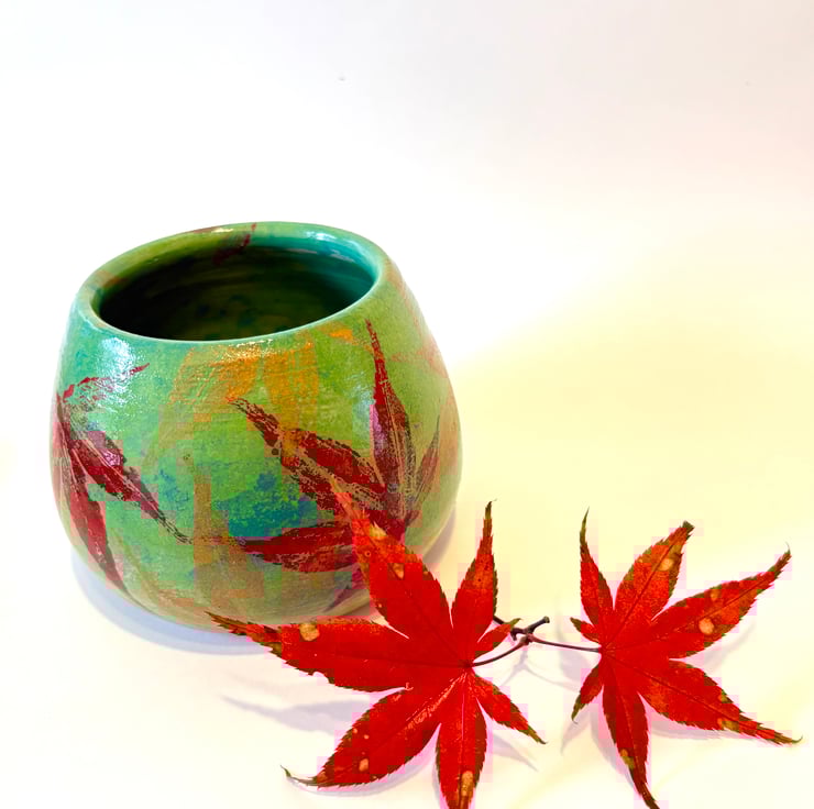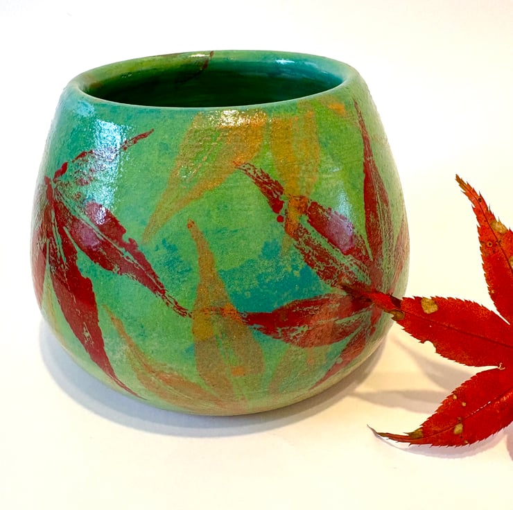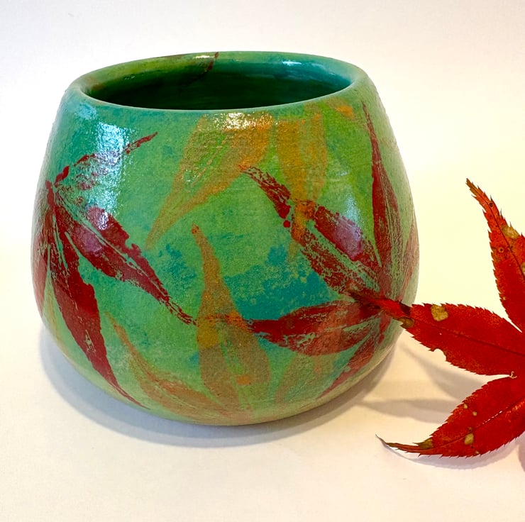 This hand thrown vase has been decorated with a sponged lime green and teal background and then I have painted acer leaves from my garden with autumnal underglazes and used them to print a unique pattern on the vase. Finished off with a shiny clear underglaze it makes a lovely stoneware vessel. The vase is 9cms tall and 10cms at its widest point.