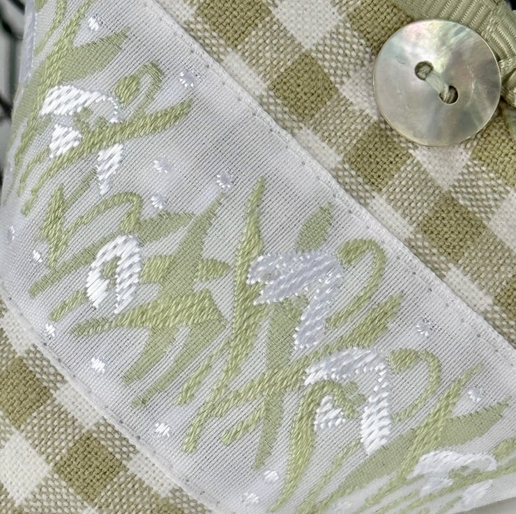 And for January, it's the return of the popular Snowdrop Heart, this year in soft sage green and white gingham checks and adorned with a stunning woven ribbon featuring winter's beautifully delicate snowdrops, glimmering silver-white and dancing above pale green stems and leaves on a white background.