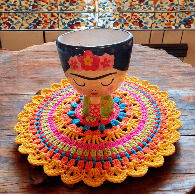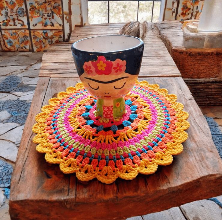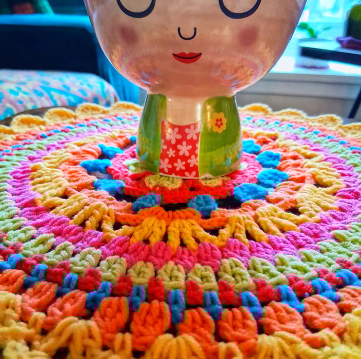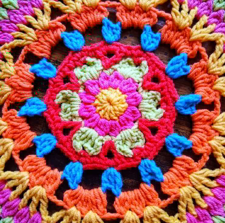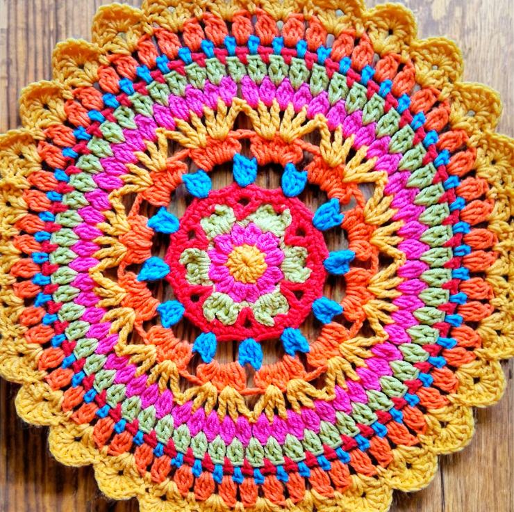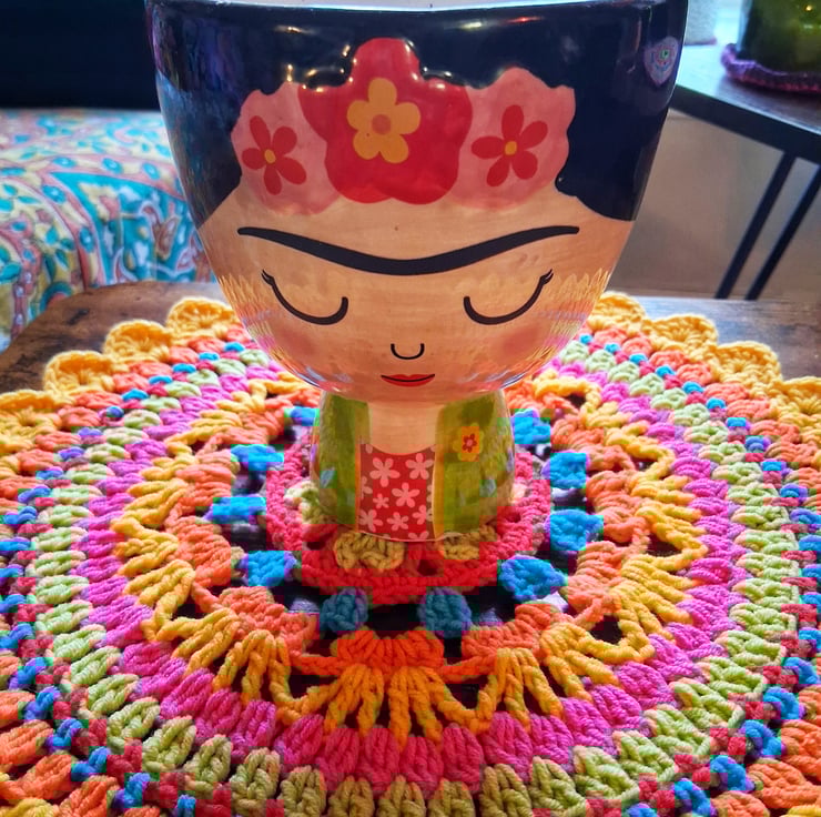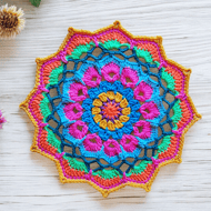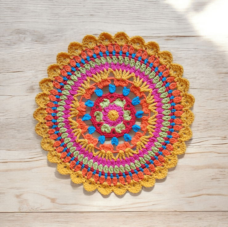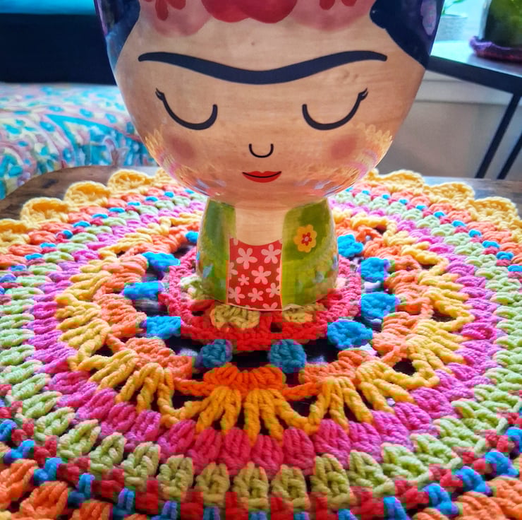 Bright crochet mandala doily. 30 cm in diameter. Perfect for giving your table a pop of colour. Crocheted in vibrant cotton blend yarn to maintain colour and ease of wash.