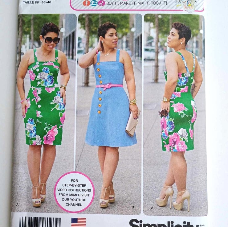 Simplicity 8123 Sewing pattern Mimi Style. A sleeveless summer dress with A-line or slim line variations, button front and wide shoulder straps.