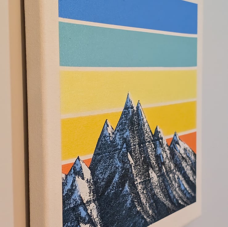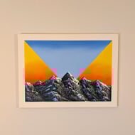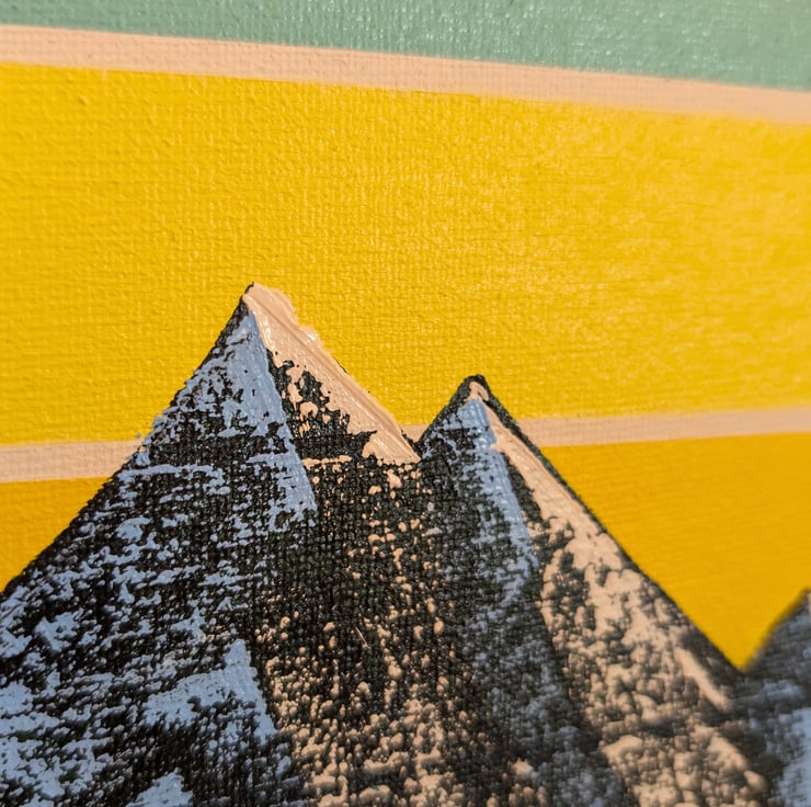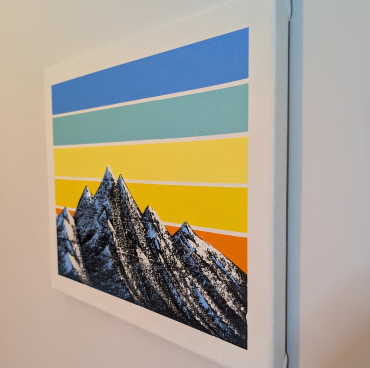 This is an original oil painting of a mountain range with a geometric sunset in the background. The retro design and colour choices frame the snow-capped mountains on an A3 canvas.