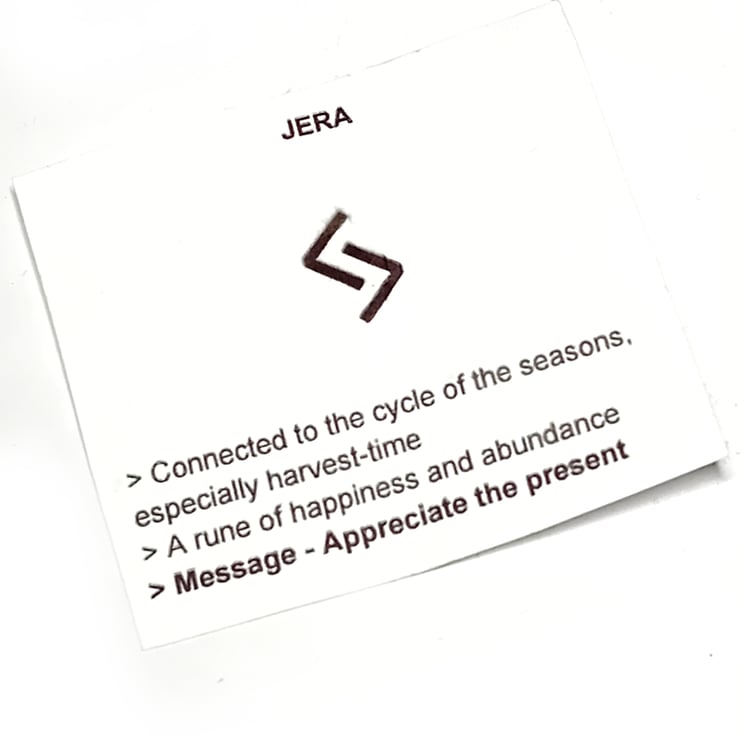 Jera, (pronounced yeah-aww) is a rune connected to the cycle of the seasons, especially harvest-time. It can symbolise happiness and abundance and reminds you that everything is a cycle and nothing lasts forever - Appreciate the present.