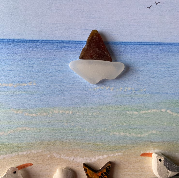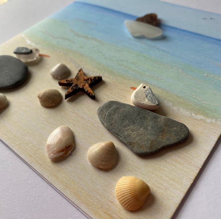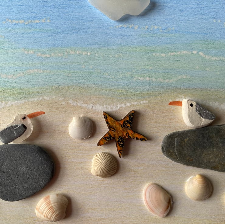 A new version of my popular seaside design featuring sea glass, shells, pebbles and a little piece of pottery for one of the gulls. All found on the beaches of Cornwall.