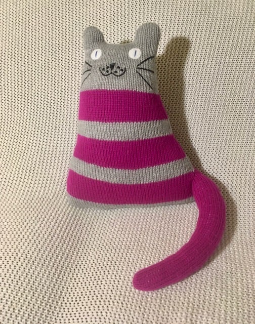 Our lovely cat is handmade from a mix of grey wool and DK acrylic yarn in magenta pink.