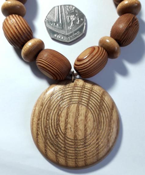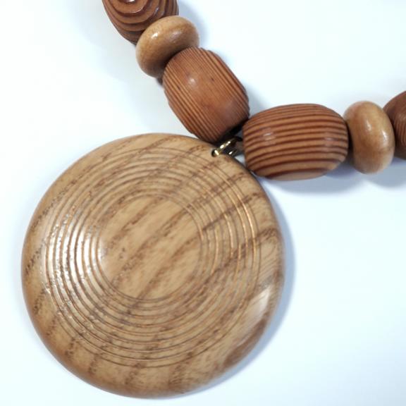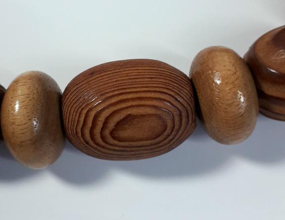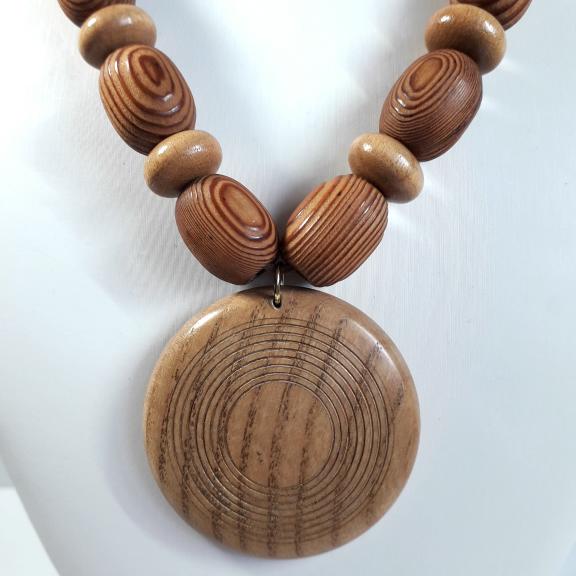 There are light to medium colour tones of wood in this necklace.
