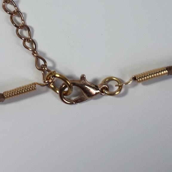 The beads are strung on a 46cm/ 18" light brown faux suede cord finished with a gold plated lobster claw fastener and 5cm extension chain.