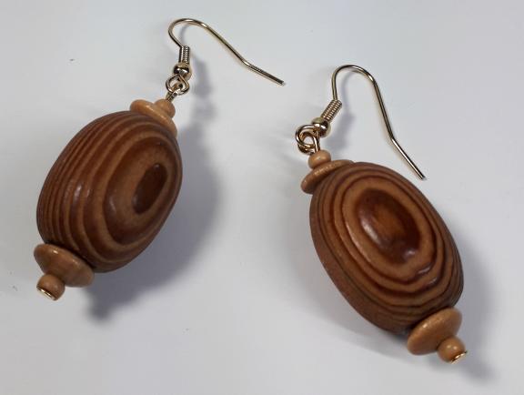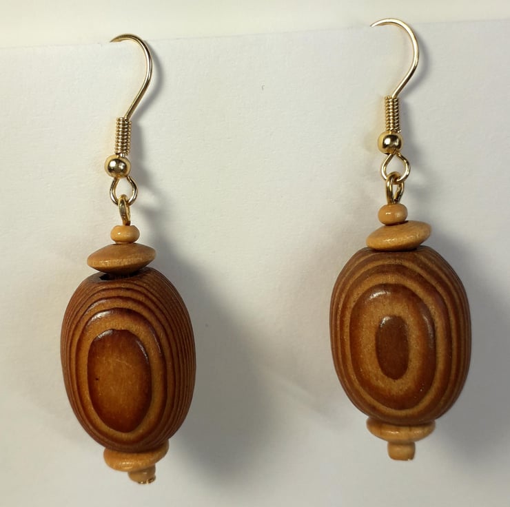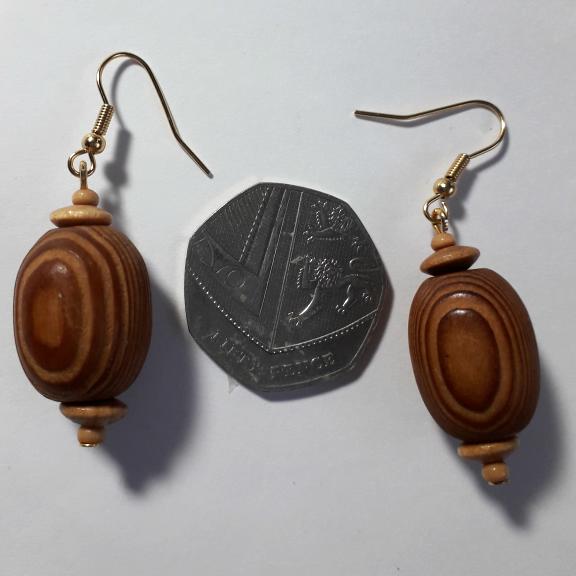 These earrings have been made with large ridged oval wooden beads with small wooden beads at each end, they match my round wooden pendant necklace.