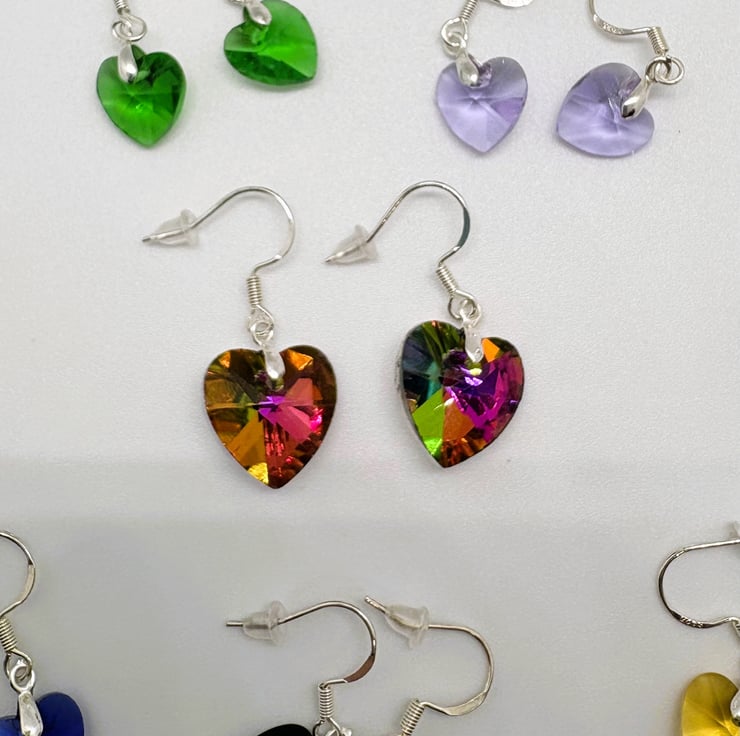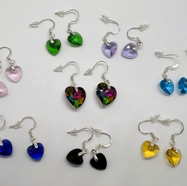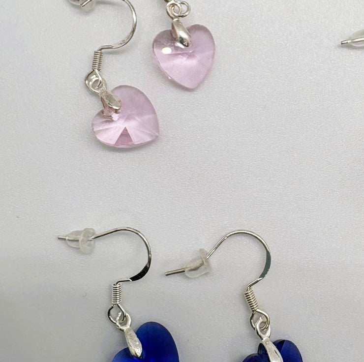 Beautiful crystal glass heart earrings with sterling silver bail and fish hook findings, hearts measure 10mm at widest point.