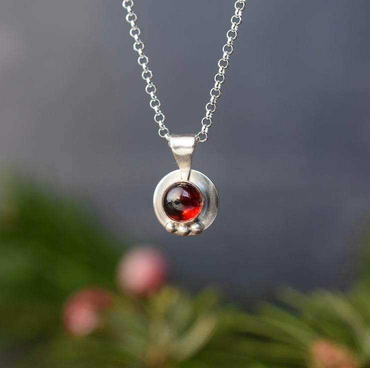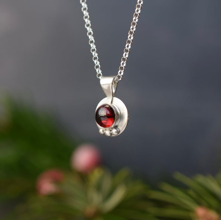 This dainty, artisan crafted necklace features the beautifully rich red hues of garnet set on a circle of solid sterling silver, all finished with a trio of tiny silver pebbles. I use almandine garnet stones for this design as it has the deepest red hue of the common varieties of garnet and seems to glow from within. The stones originate from Mozambique.