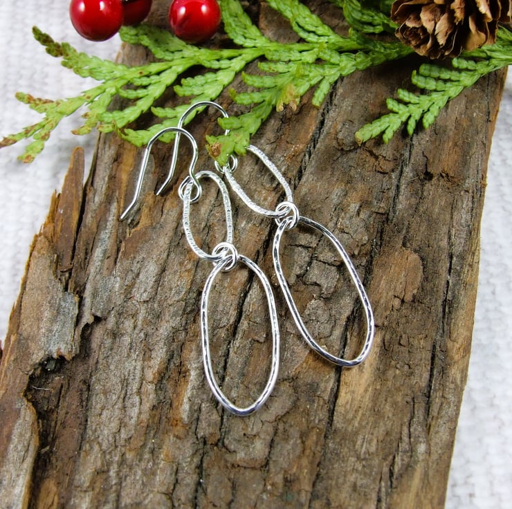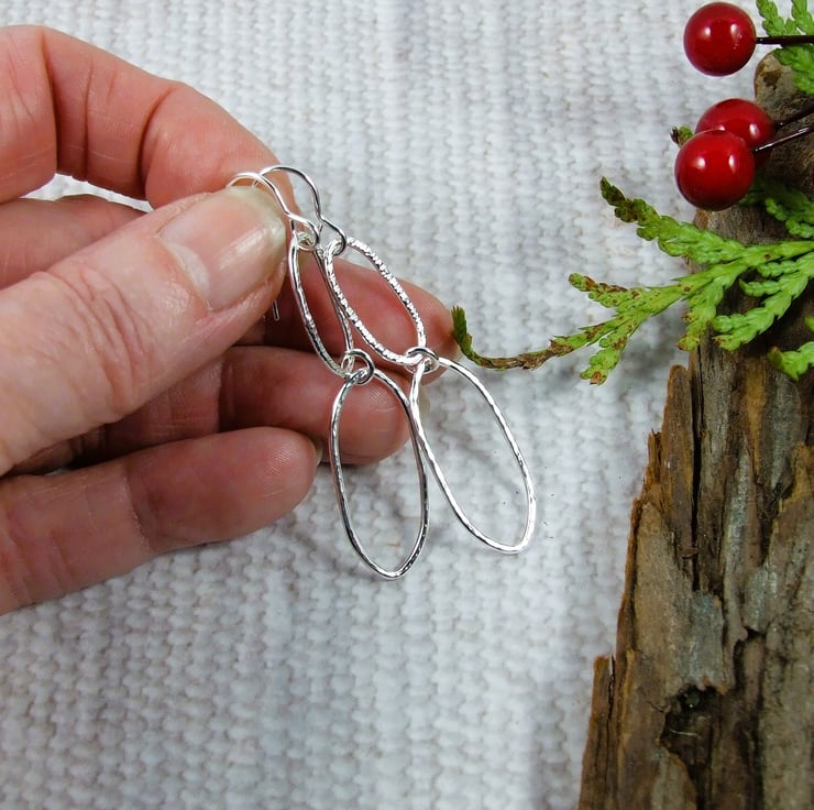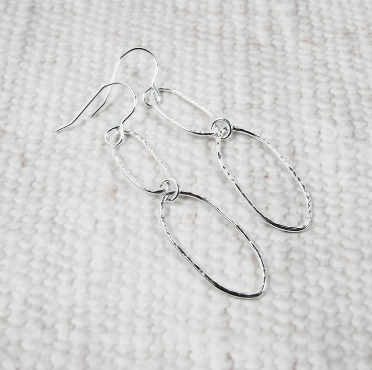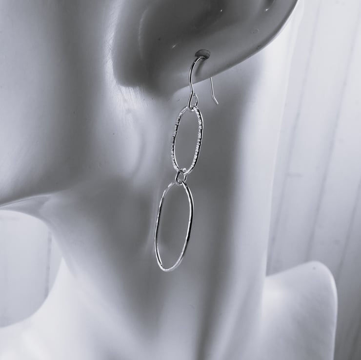 I have created the shapes using 1.2mm recycled silver wire. Shaped by hand into two different size long oval shapes and soldered. Hammered with two different hammers for different textures and fitted to sterling silver ear wires.