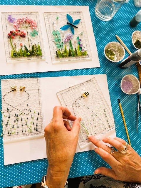You will learn how to build up your panels by using glass pieces, rods, glass paint and frits (crushed glass). You will also get the opportunity to learn how to cut glass too if you wish!