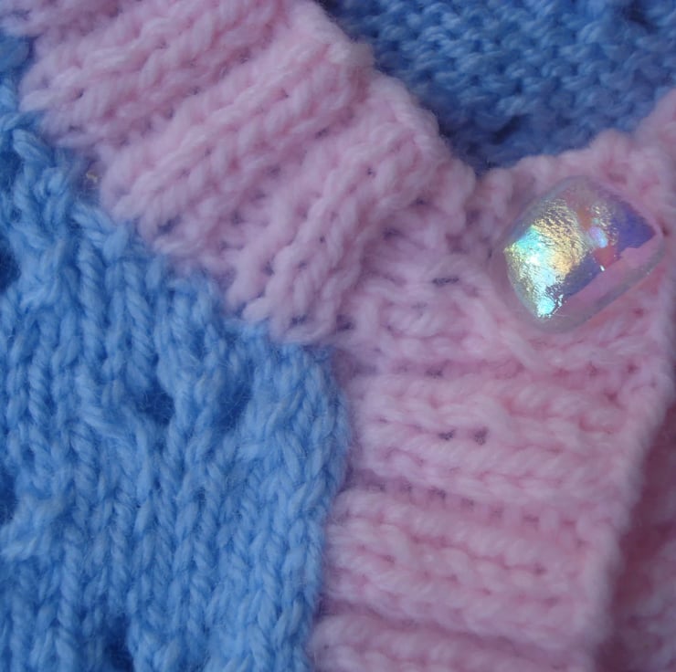 This is a hand knitted bolero, pink and blue, with short sleeves and one hand made glass button at the neck. It would look great over a little dress. Made from premium soft acrylic yarn. Chest 50cm (20"), back length 23cm (9"). Approx size 6 to 9 months.