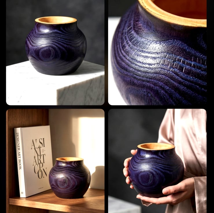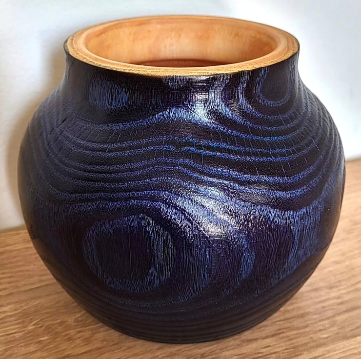 This handcrafted vase is turned from ash wood, then carefully burnt to enhance the natural grain and texture of the timber. The surface has been embellished with blue wax, which settles into the grain and highlights the flowing patterns created by the burning process. Slightly smaller in size at just under 5 inches tall and approximately 5 and a half inches wide, this vase has a compact yet bold presence, making it ideal as a decorative accent or for dried arrangements.